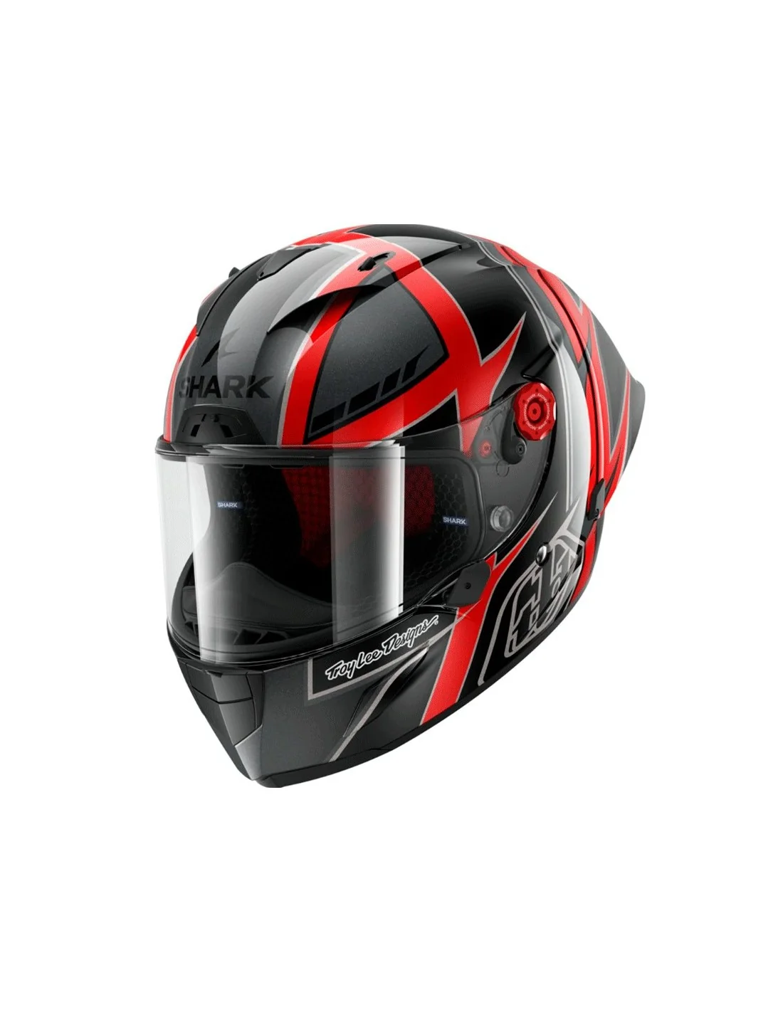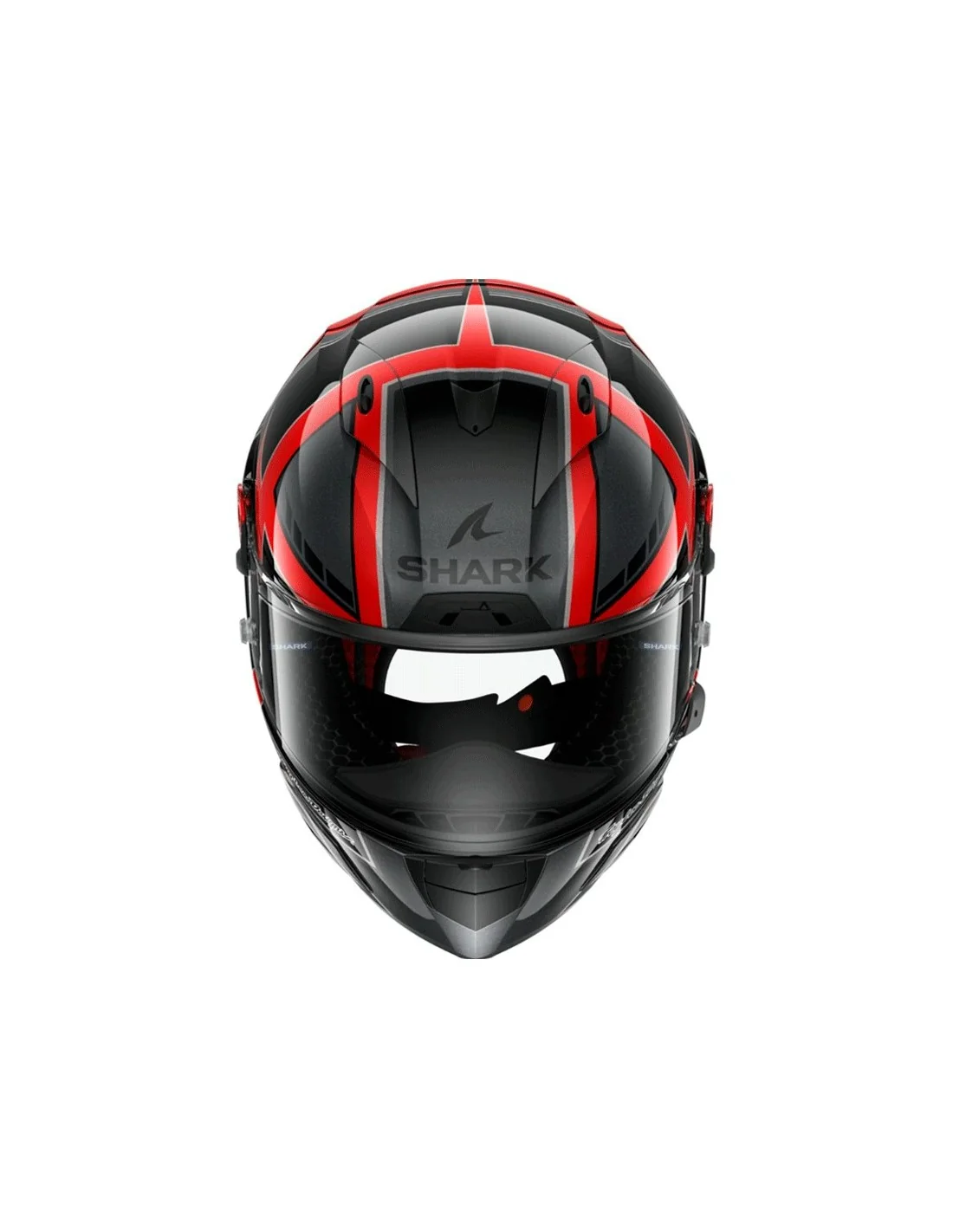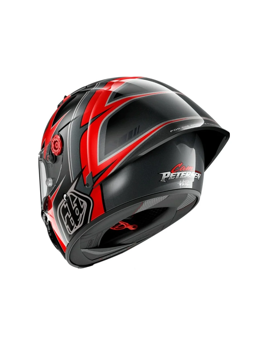 Shark Race-R PRO GP 06 TLD Cam Petersen Helm Schwarz / Rot / Anthrazit. Shark entwickelt seinen sportlichsten Helm weiter und stattet den neuen Race-R Pro GP 06 mit den neuen ECE 22.06-Vorschriften aus. Die Außenschale aus COVA-Struktur (Kohlefaser und Aramid) bietet eine hervorragende aerodynamische Leistung. Es hält mit 363,6 km/h den Geschwindigkeitsrekord in der MotoGP! Der Heckspoiler zeichnet sich dadurch aus, dass er die aerodynamische Leistung und Stabilität bei hoher Geschwindigkeit verbessert. Dies ist der Helm der Spitzenklasse, der das Ergebnis der Erfahrung von Shark auf den höchsten Wettbewerbsniveaus (MotoGP und SBK) mit mehr als 250 Podestplätzen ist.