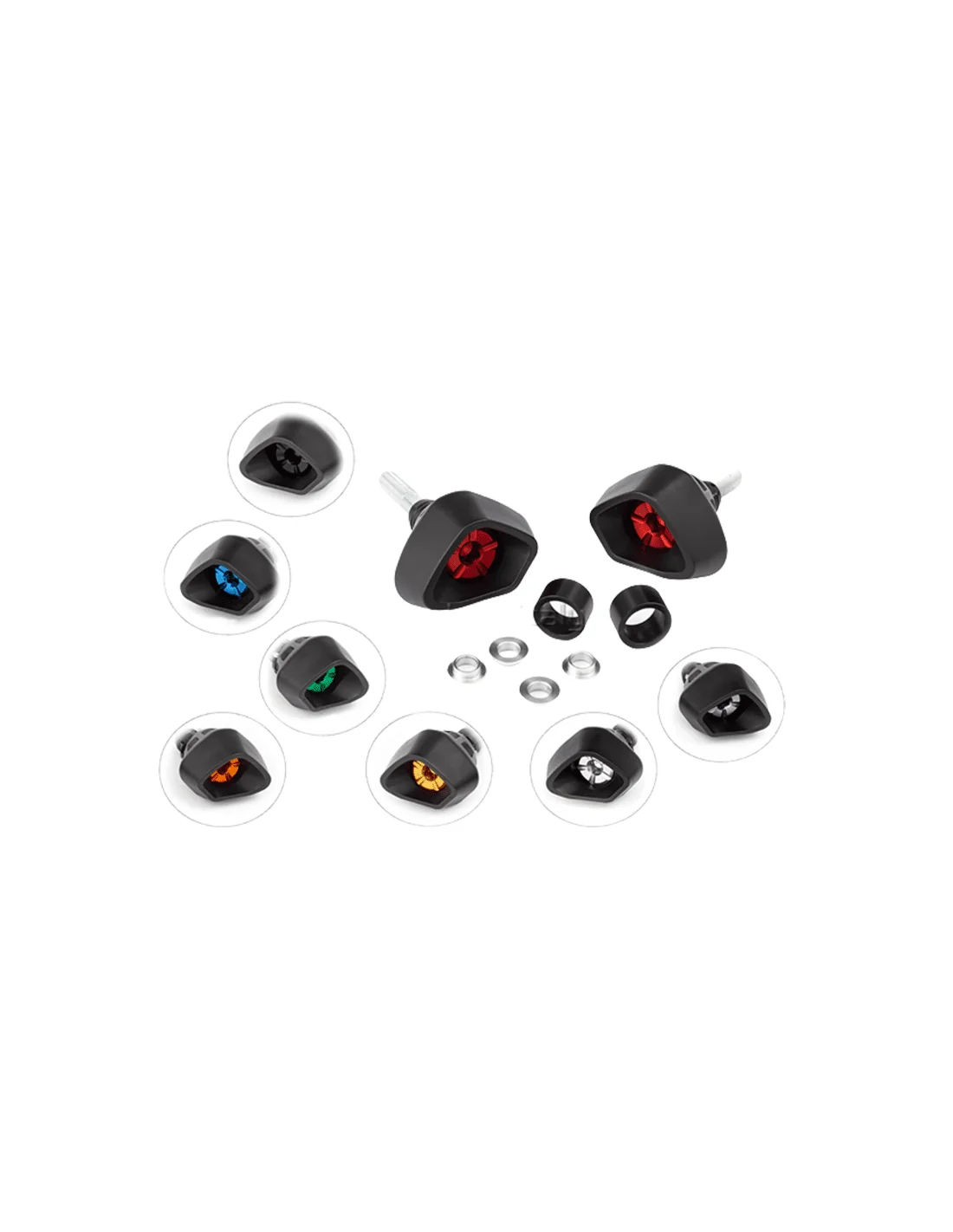 Auf diese Weise gleitet der Protektor mit dem Asphalt ohne übermäßigen Materialverbrauch oder gefährliche Überschläge. Die aerodynamische Form der Protektoren verleiht dem Motorrad nicht nur einen aggressiveren Stil, sondern reduziert auch die Möglichkeit, dass der Slider an einem Hindernis blockiert, auf ein Minimum.