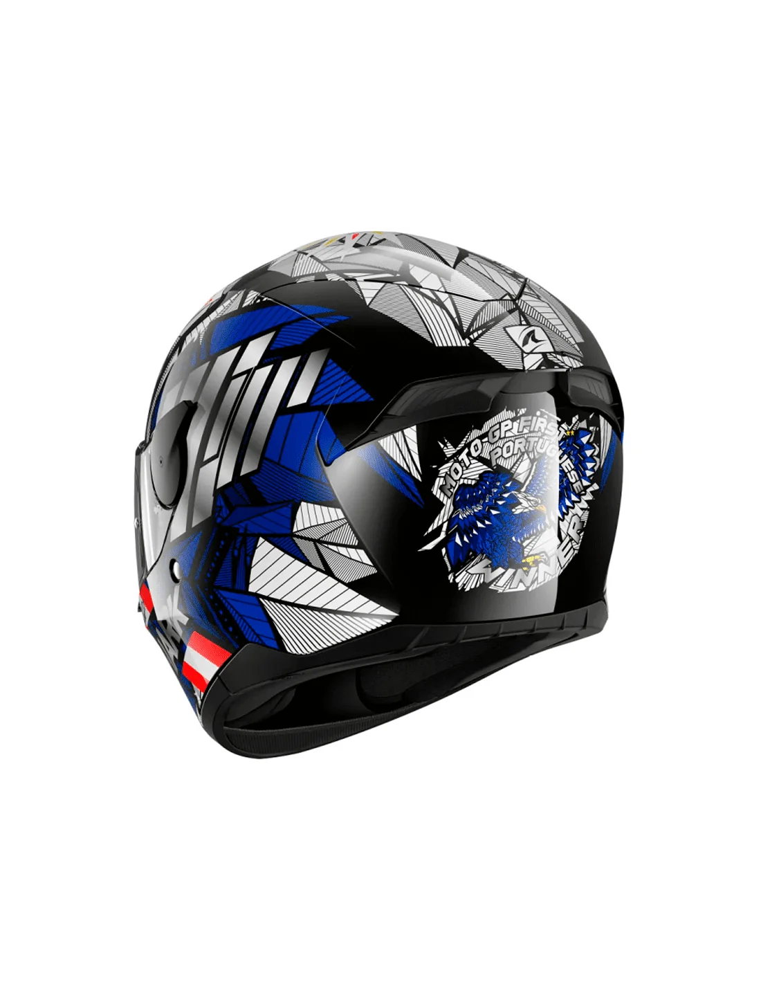 Der neue Heckspoiler bietet eine hohe aerodynamische Wirkung und stabilisiert den Helm mit hoher Geschwindigkeit. Es wurde so konstruiert, dass er sich bei einem Unfall löst, um den gesamten Helm möglichst wenig zu beeinträchtigen und dem Piloten ein Höchstmaß an Sicherheit zu gewährleisten. Das Profil des Design-Racing-Kinns reduziert die Luftwiderstand hinter der Verkleidung des Motorrades.