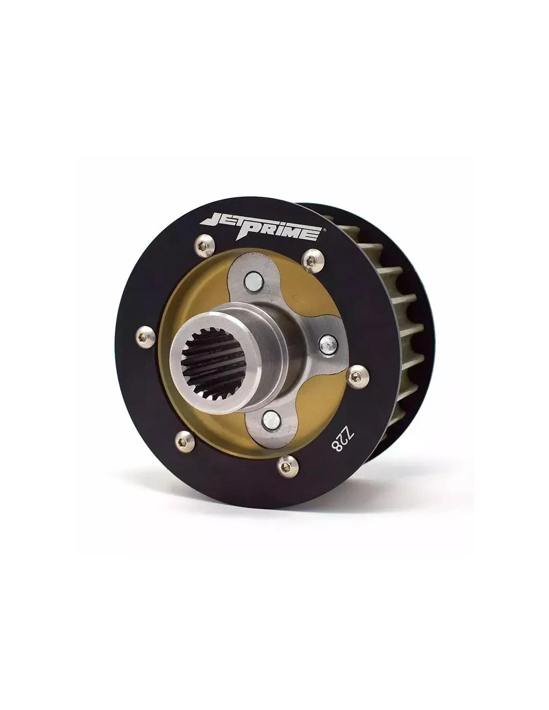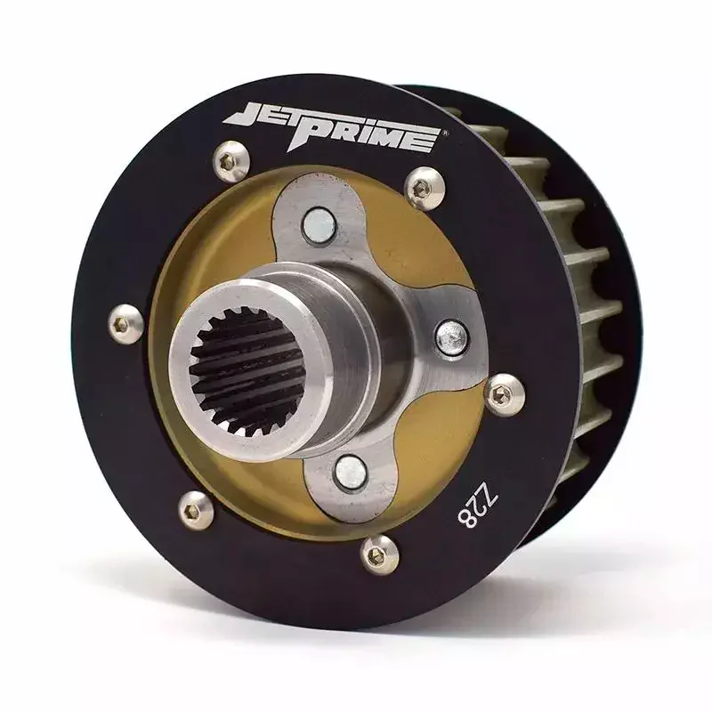 Jetprime-Kettenräder bestehen aus 7075 Ergal mit 25 Mikron Hartrost. Dadurch ist es sehr leicht und gleichzeitig sehr verschleißfest. Für die Zentralnabe hingegen wurde ein besonderer legierter Stahl verwendet, der bewusst nicht wärmebehandelt wurde.