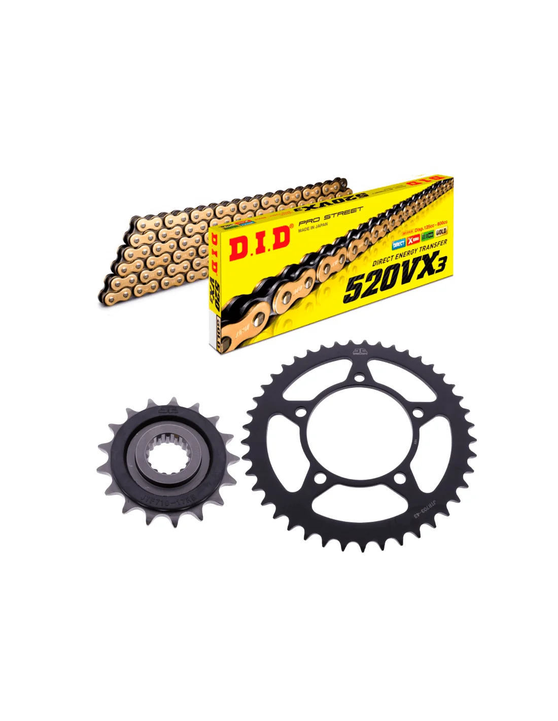Diese Entwicklungskits ersetzen die Originale und haben ab Werk die gleiche Konfiguration wie das Standardmotorrad in Bezug auf die Anzahl der Kettenradzähne, den Zahnkranz und die ursprüngliche Breite (Teilung) der Kette, wobei die Länge diesem Verhältnis entspricht.