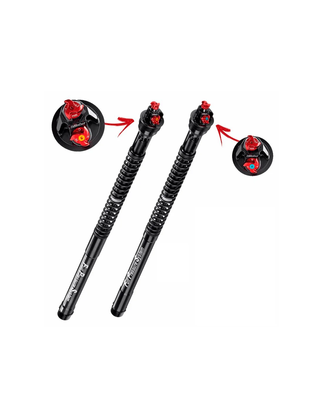 Für extreme Konkurrenz geschaffen, die neue Technologie im Dienste des Treibers. Die ECH29-Gabelpatronen BITUBO Druckbehälter enthalten eine Reihe innovativer Systeme wie FPS, EC und LC. Diese Systeme sind das Ergebnis eines starken und intensiven Engagements für Forschung und Entwicklung, das unsere F & E-Abteilung in Zusammenarbeit mit den besten offiziellen Teams, die am WSBK, an der Superbike-Weltmeisterschaft (SBK World Championship) und an der britischen, deutschen und italienischen Meisterschaft teilnehmen. Alle Einstellungen sind auf den oberen Deckeln der Gabel für einen einfachen und schnellen Zugriff und Handling angeordnet: Mit Hilfe von zwei kleinen Rädern auf jedem Deckel wird die hydraulische Vorbelastung der Federn in 12 mm und 6 Runden eingestellt, während der Rückprall und die Kompression auf jedem Deckel der Gabel für eine einfachere und bequemere Einstellung komplett getrennt sind, beide mit 24 Einstelltasten.