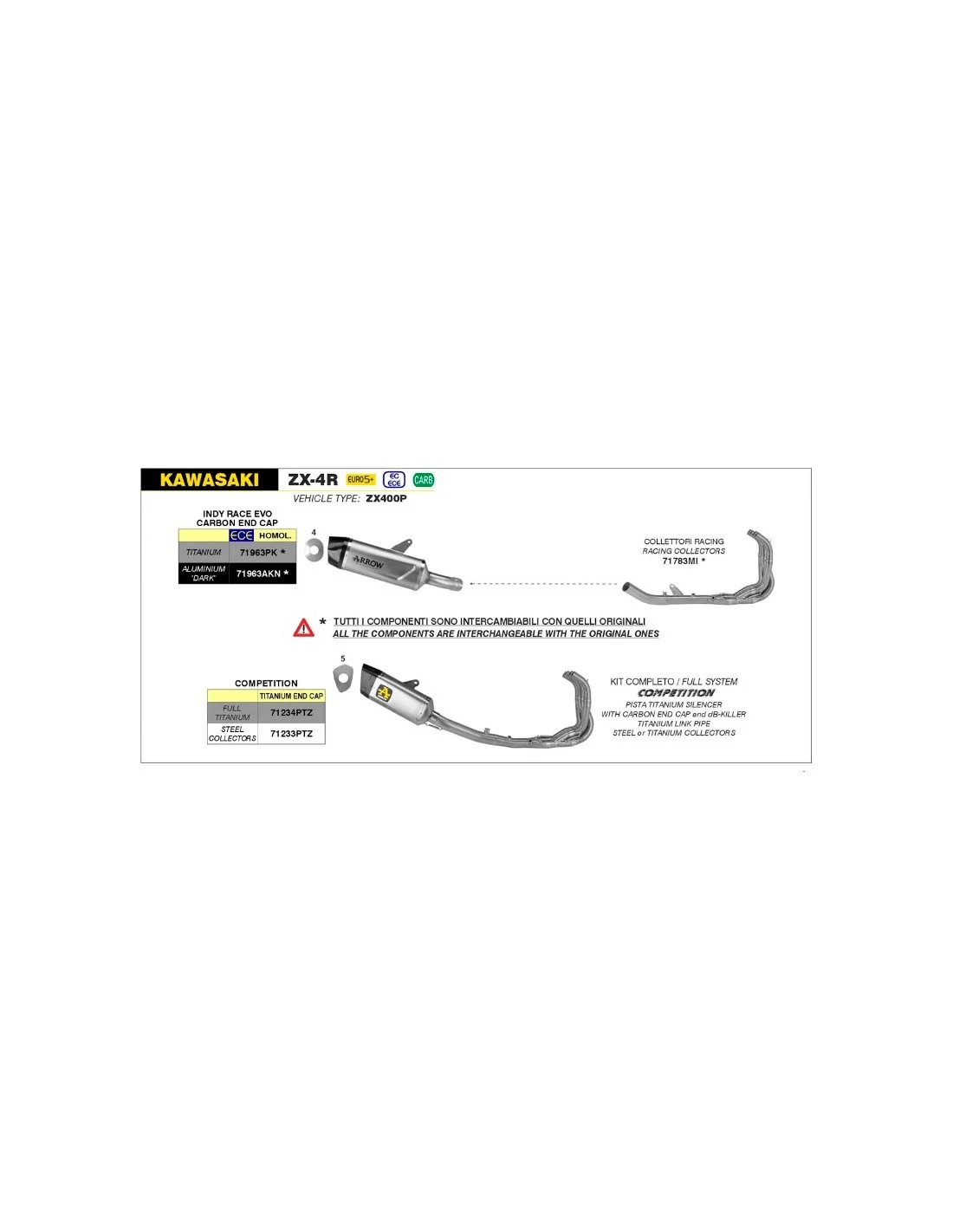 Kawasaki ZX-4R 2024–2024: Der Arrow-Auspuff wäre für EURO 5+, EC ECE, CARB zugelassen, wenn er an den Originalkrümmern montiert wird. Wenn Sie die ARROW-Sammler verwenden, ist der Auspuff nicht für den CO2-Ausstoß zugelassen, da sich im Inneren kein Katalysator befindet.