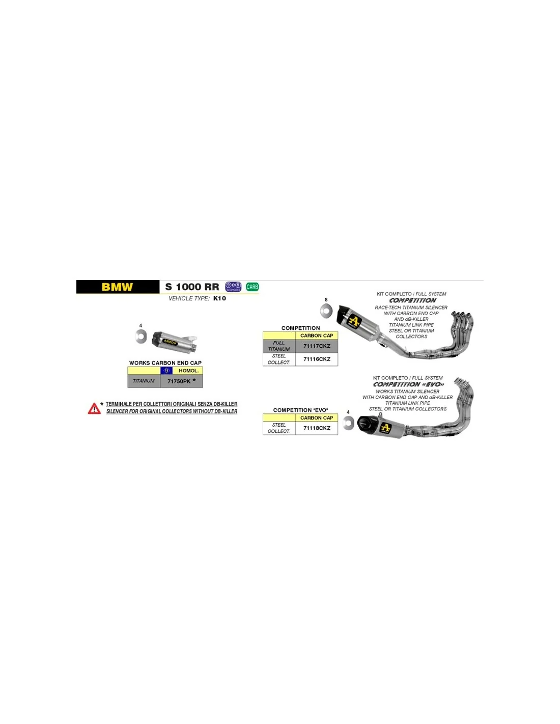 Este escape completo 71118CKZ pertenece al modelo Competition Evo de Arrow, el cual ha sido desarrollado por los técnicos del Departamento de I+D de Arrow, con el objetivo de ofrecer el máximo rendimiento y cumplir con las exigencias más altas de los equipos de competición de SBK y SS a nivel mundial.