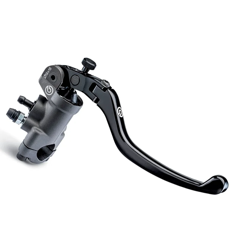 El cilindro maestro radial se define así por su configuración tal que tanto la fuerza de los dedos sobre la palanca como la de la propia palanca sobre el pistón actúan en la misma dirección, es decir, radialmente con respecto al punto de anclaje del cilindro maestro, es decir, el manillar.