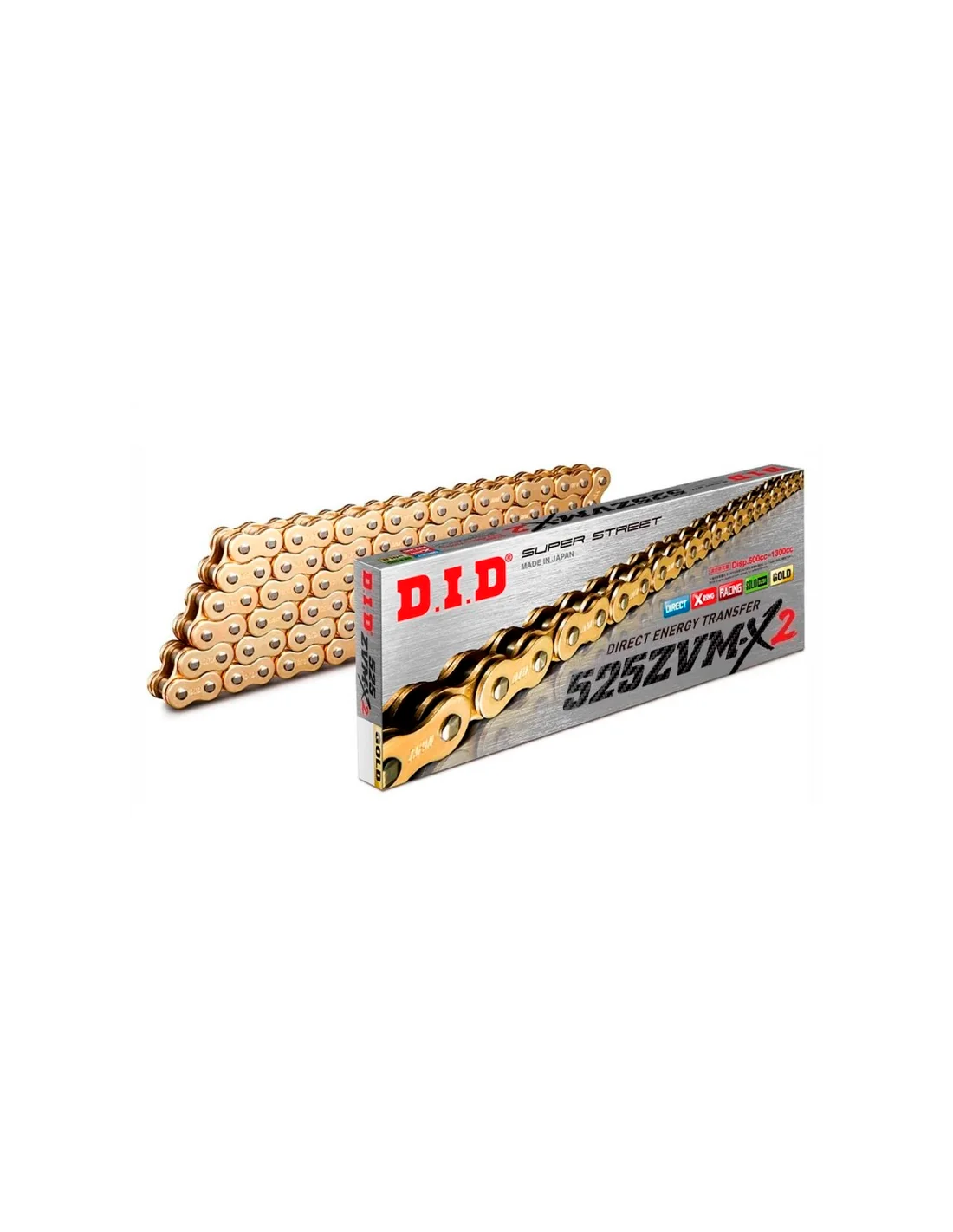 La serie ZVM-X2 de DID es la nueva versión mejorada de cadena ZVM-X tiene mayor resistencia que la serie VX y está diseñada para motocicletas de peso pesado con tremenda torsión y potencia.