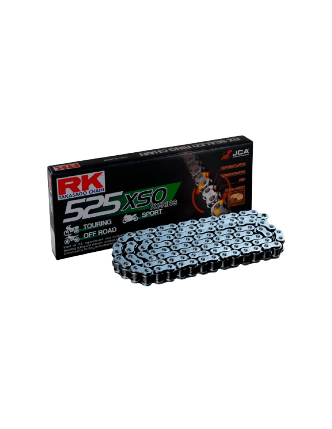 Las cadenas XSO de RK son la gama más alta de cadenas Superbike y Roadracing, ofreciendo el mejor rendimiento a alta velocidad y con calor extremo, destinada a motos de carretera de altas prestaciones. El fabricante es sponsor oficial del equipo HRC de Moto GP