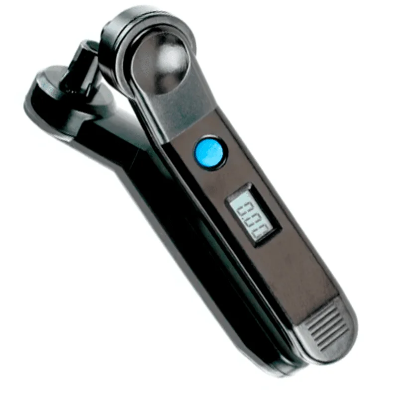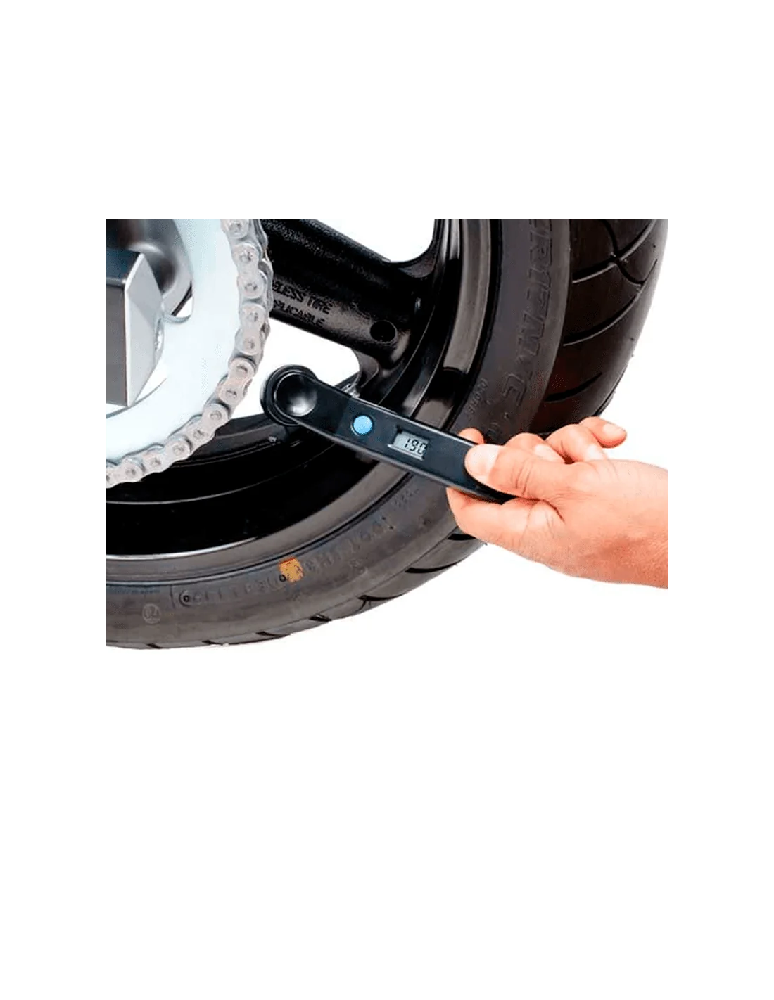 - Presionar la válvula de la rueda firmemente por un segundo y extraer el medidor. Se visualizará la presión durante 15 segundos.