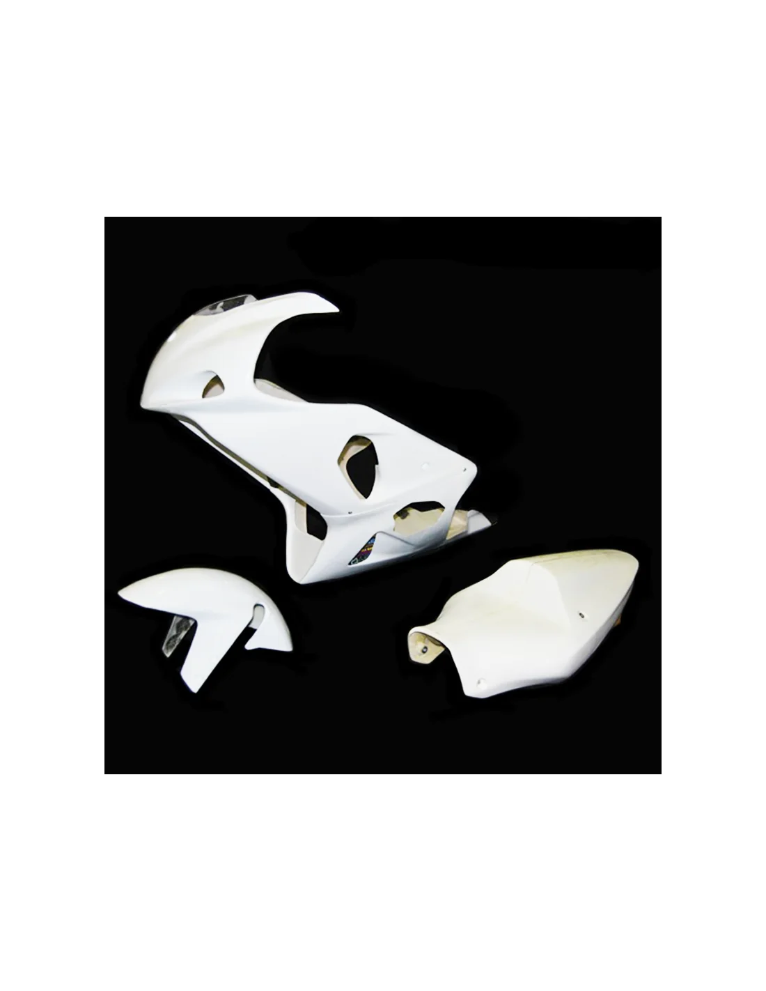 Fabricado en fibra de vidrio en color blanco. La zona de la tornillería va pre-marcada, lista para agujerear y reforzada con carbono - kevlar. Este refuerzo evita las roturas en las zonas más críticas del carenado, que son los puntos de anclaje.
