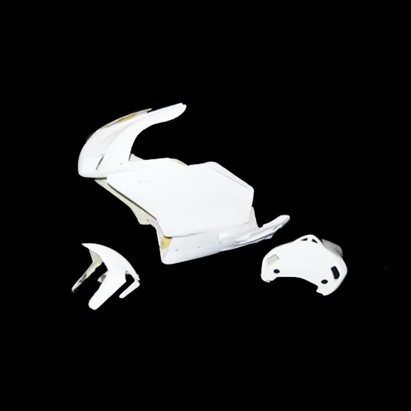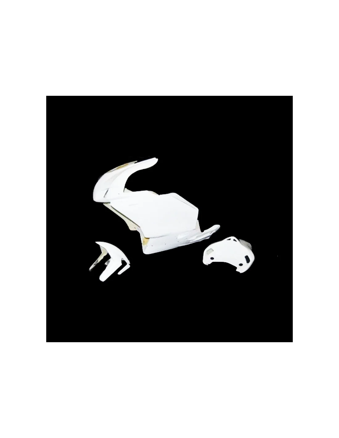 Fabricado en fibra de vidrio en color blanco. La zona de la tornillería va pre-marcada, lista para agujerear y reforzada con carbono - kevlar. Este refuerzo evita las roturas en las zonas más críticas del carenado, que son los puntos de anclaje.