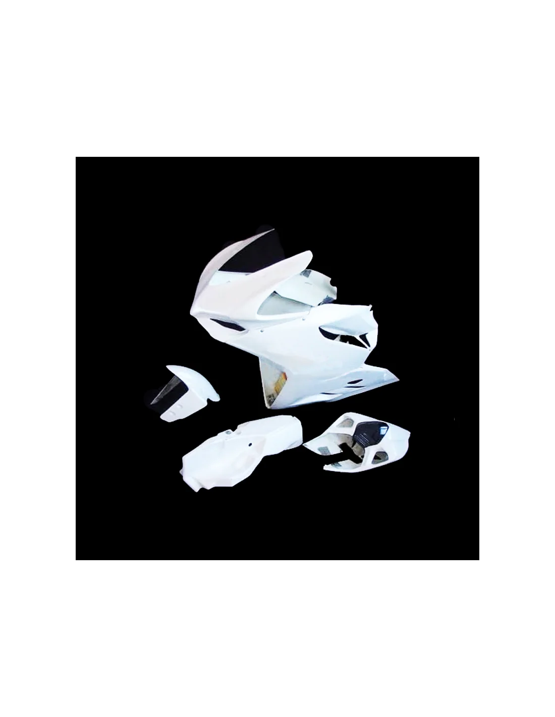Fabricado en fibra de vidrio en color blanco. La zona de la tornillería va pre-marcada, lista para agujerear y reforzada con carbono - kevlar. Este refuerzo evita las roturas en las zonas más críticas del carenado, que son los puntos de anclaje.