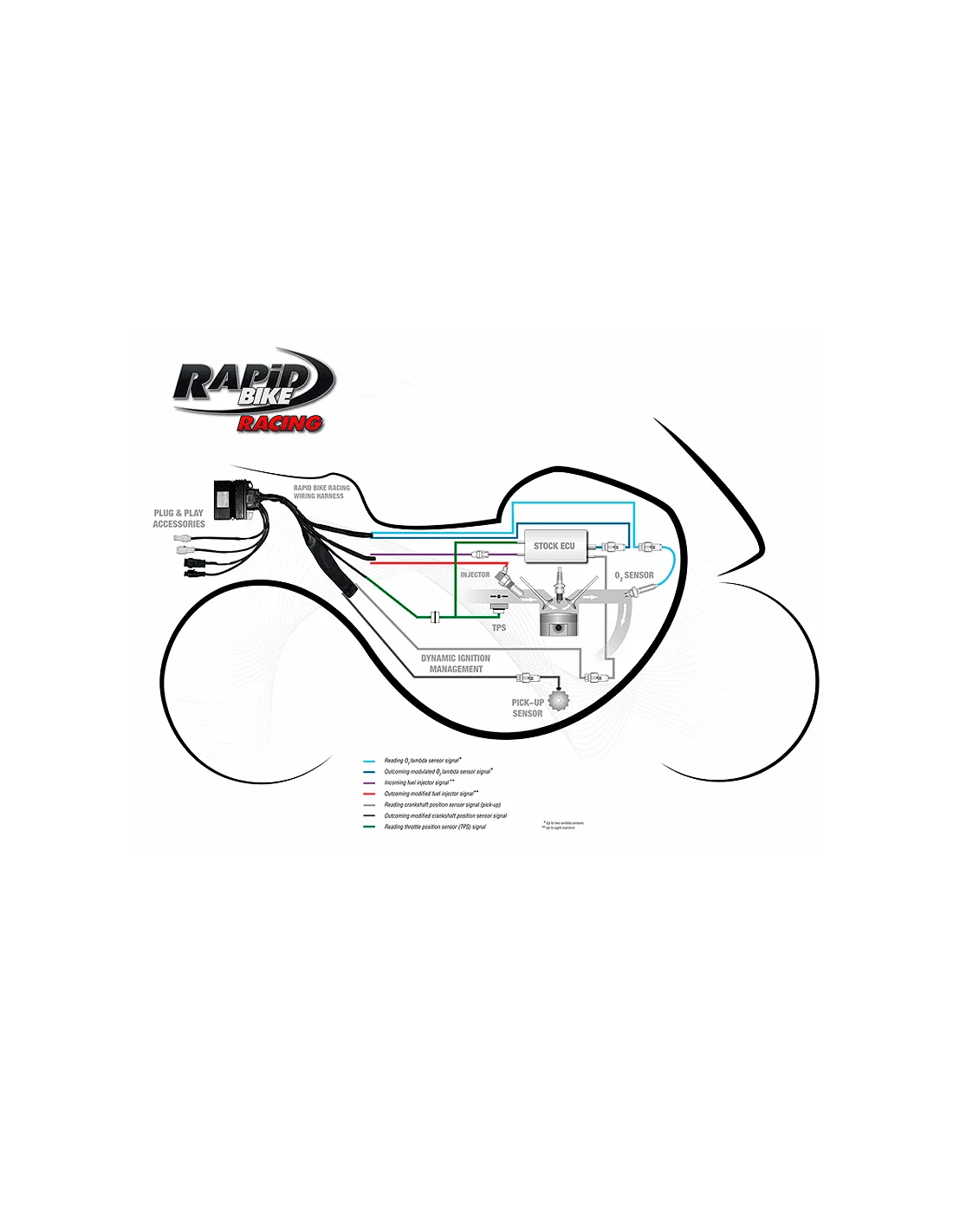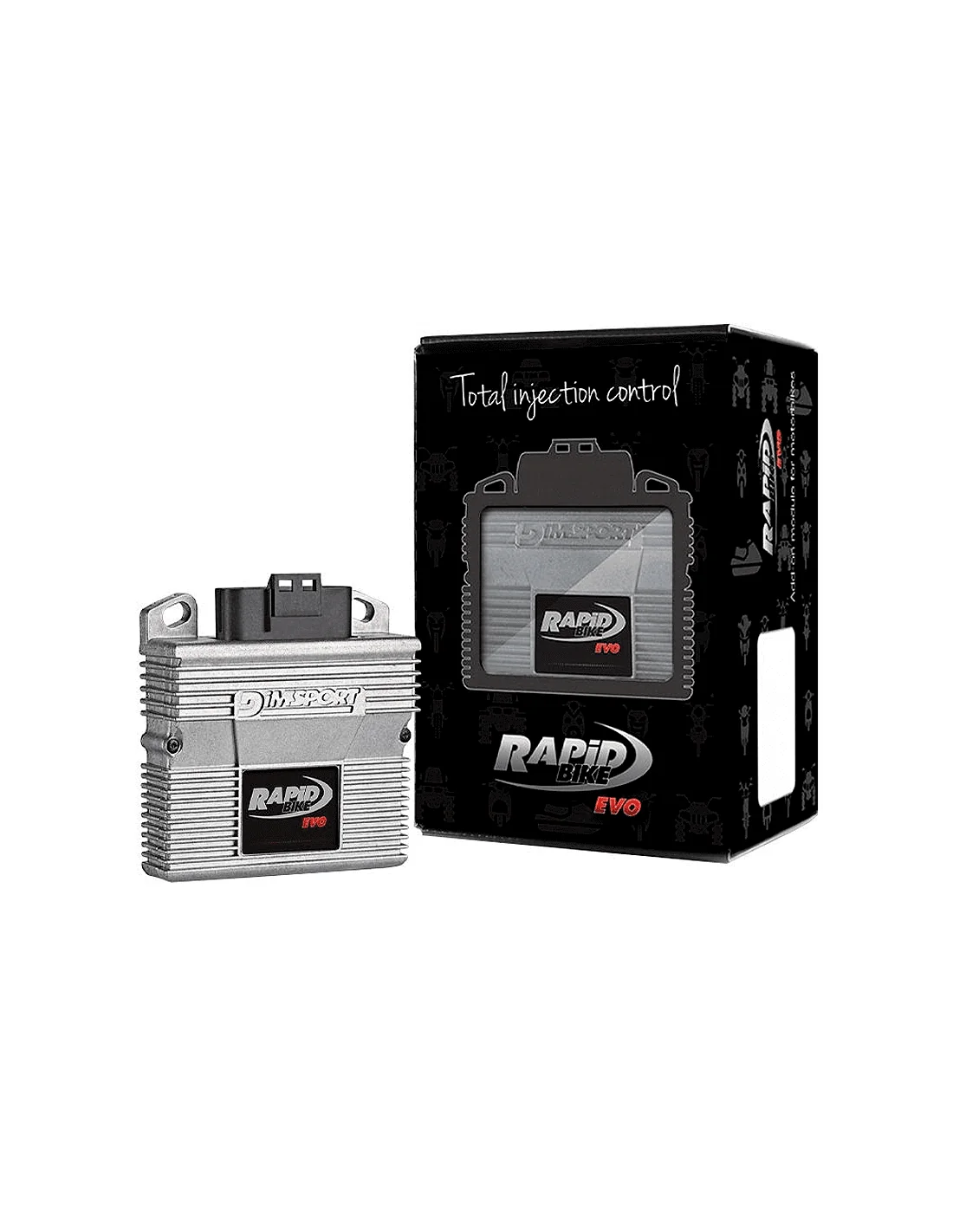 La unidad de control adicional Rapid Bike EVO ofrece un control total de la carburación mediante la gestión de todos los inyectores originales (hasta ocho) y de la relación aire/gasolina, para poder modificar el mapa de inyección a lo largo de toda la curva de funcionamiento del motor sin percepciones de anomalías.