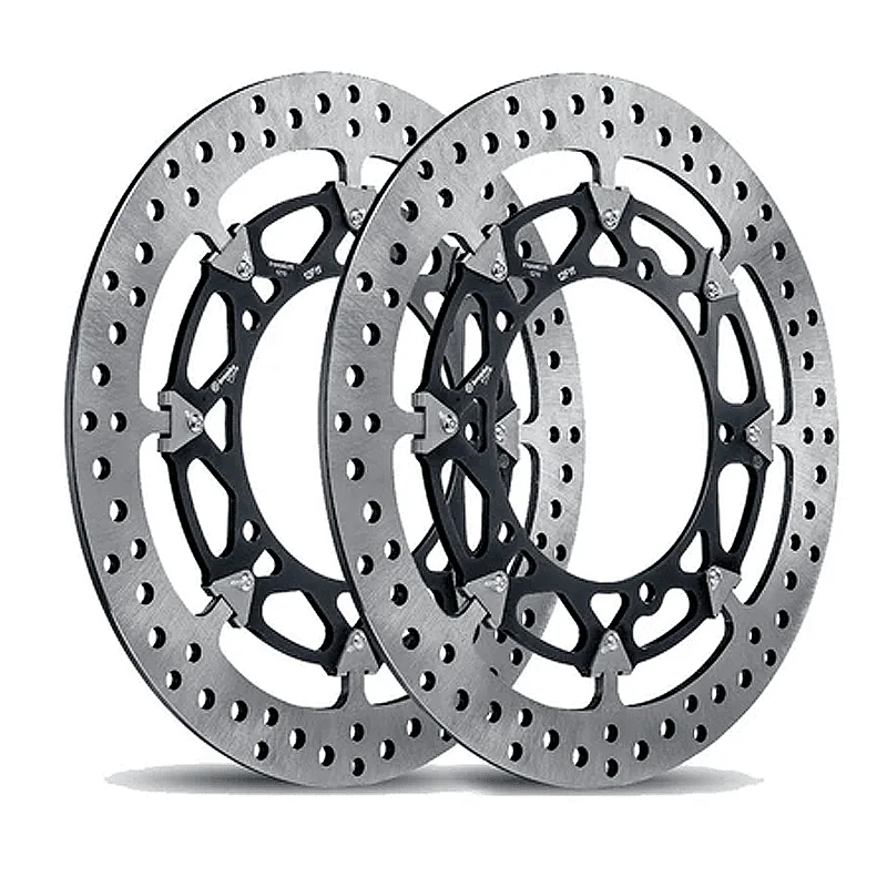 La conexión entre la carcasa y el rotor está asegurada por un sistema especial de enganche de guillotina (patente pendiente) que permite la flotación radial y axial y reduce el peso total del disco, lo que resulta en una ventaja significativa en términos de manejabilidad en comparación con el sistema de bujes tradicional. Tanto la consistencia del rendimiento como la eficiencia del acoplamiento del disco y las pastillas de freno durante el período de rodaje se han mejorado significativamente gracias a un rotor, en acero idéntico al utilizado para los discos en SBK y MotoGP, caracterizado por un nuevo patrón de orificios de diámetro diferenciado.