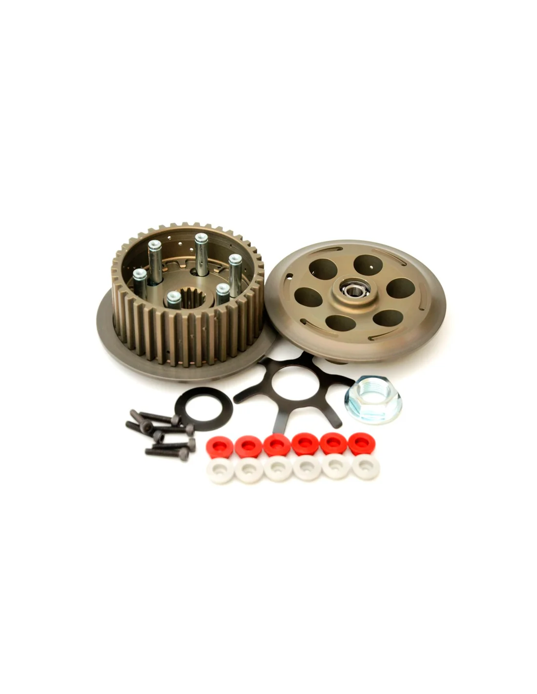 El embrague antirrebote estándar funciona bien en carretera, pero en carreras de pista se requiere un grupo específico para compensar con mayor reactividad, los efectos del frenado extremo, cambios de marcha rápidos, mayor velocidad en las curvas y cualquier modificación del motor, como mayor compresión. . Por lo tanto, se requiere una acción deslizante más efectiva, una respuesta más rápida y un nuevo acoplamiento menos abrupto. El embrague TSS tiene rampas más suaves y un funcionamiento más suave. Gracias a la posibilidad de elegir el número de muelles secundarios o el diseño de las copas de retención de los muelles, el piloto puede ajustar el funcionamiento de la unidad en detalle para adaptarse mejor a su estilo de conducción y a las condiciones de la pista. Además, la ventaja de peso es significativa, con ahorro de energía rotativa y efecto giroscópico, con el efecto de una mejor respuesta del motor. El grupo está fabricado en Ergal 7075.