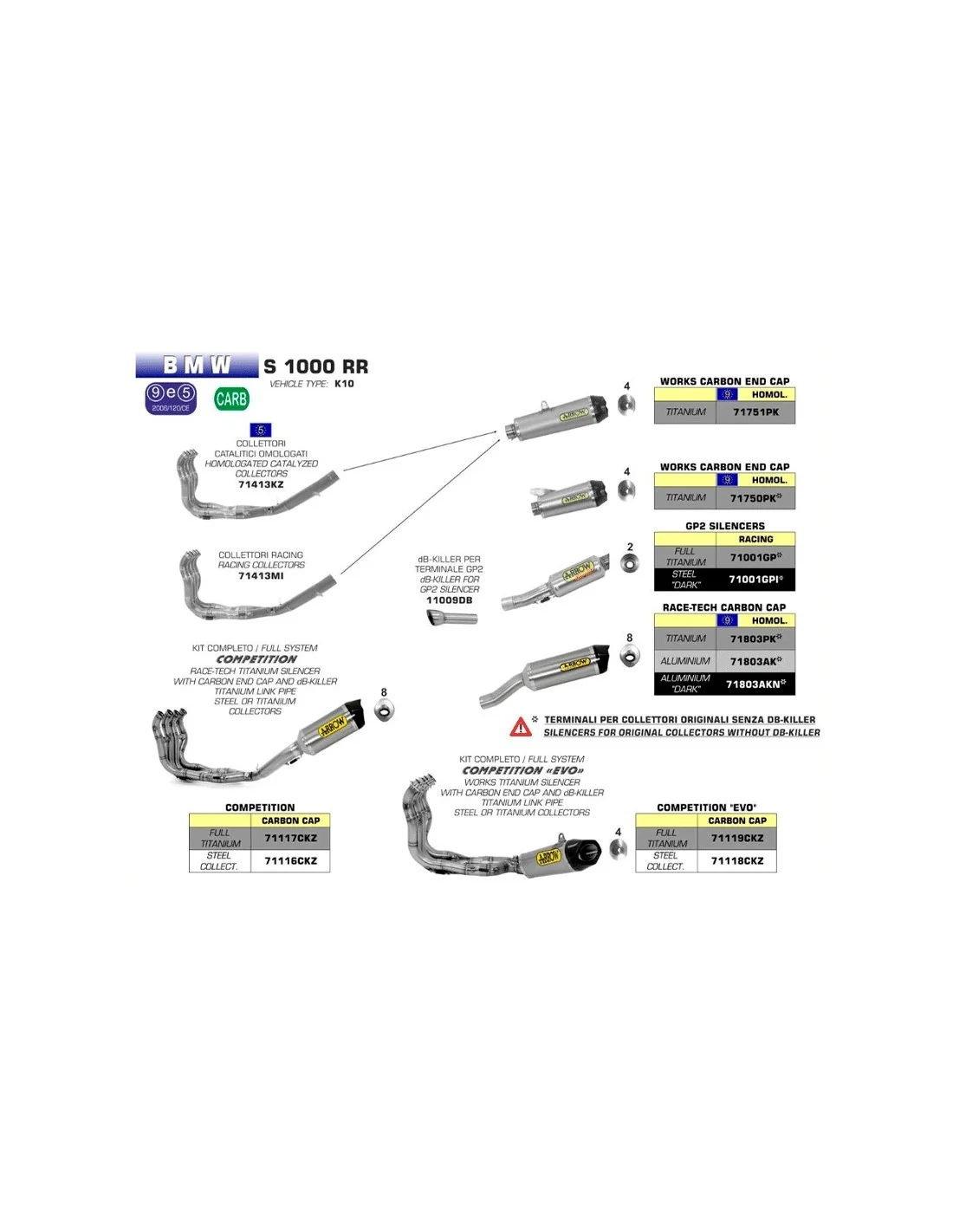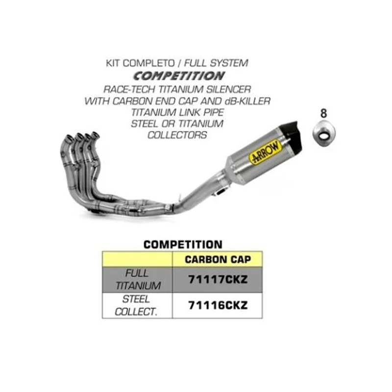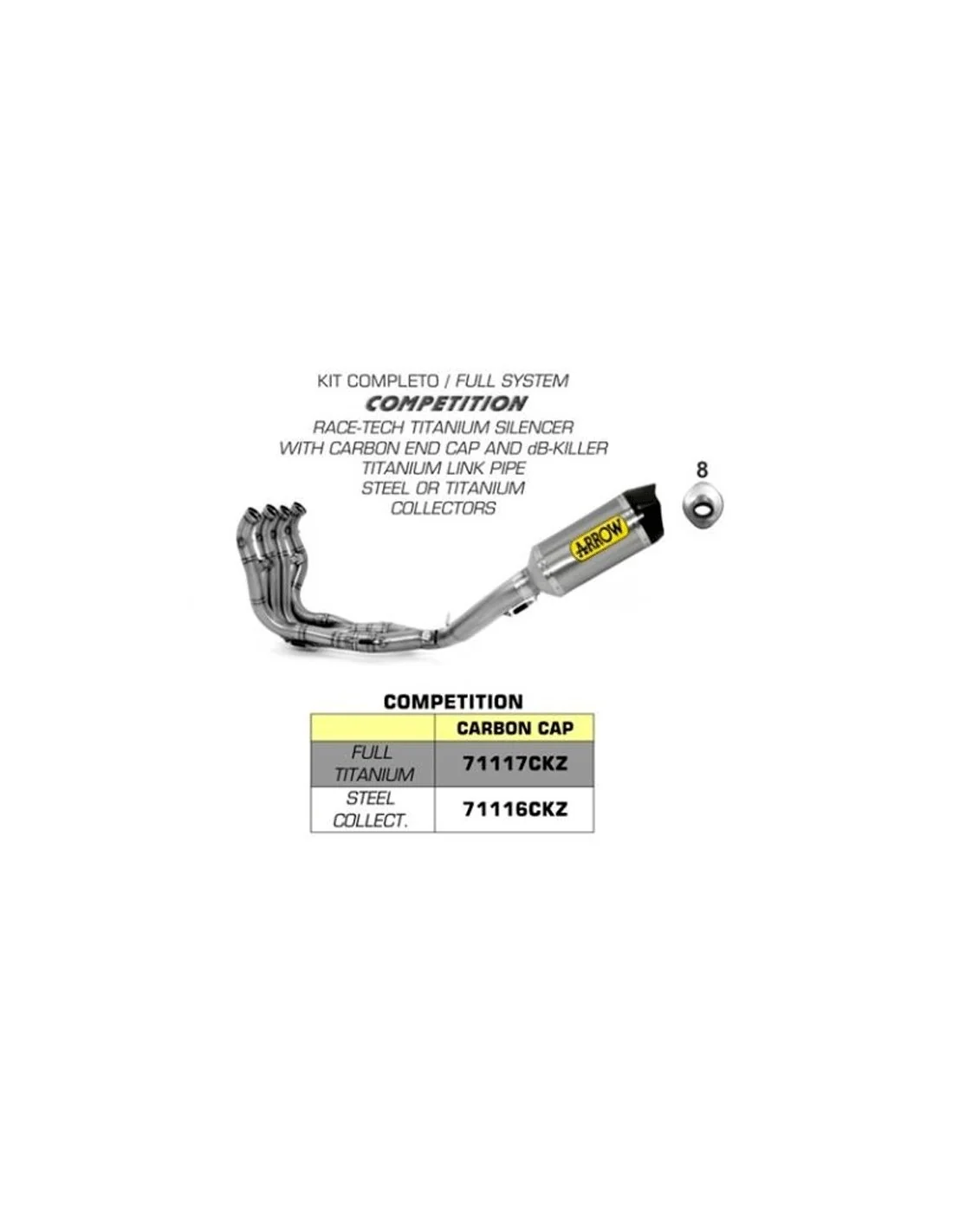 Este escape completo 71118CKZ pertenece al modelo Competition de Arrow, el cual ha sido desarrollado por los técnicos del Departamento de I+D de Arrow, con el objetivo de ofrecer el máximo rendimiento y cumplir con las exigencias más altas de los equipos de competición de SBK y SS a nivel mundial.