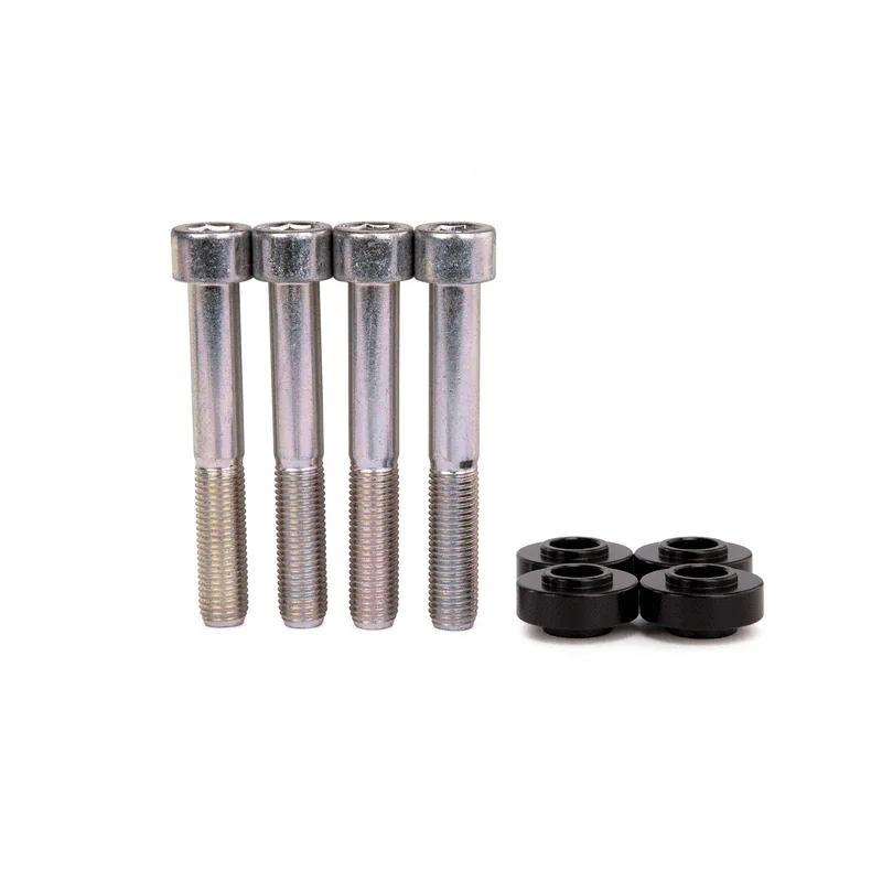 Kit de espaciadores necesarios para el montaje de pinzas BREMBO delanteras radiales monobloque BREMBO M4 (220A39710), GP4-RX (220B01010) Y GP4-RS (220C78310) con los discos originales. Kit equipado con 4 tornillos + 4 espaciadores para su correcto montaje. Con este kit espaciador es posible montar las pinzas BREMBO radiales monobloque M4 y GP4-RX en las botellas originales de la horquilla.