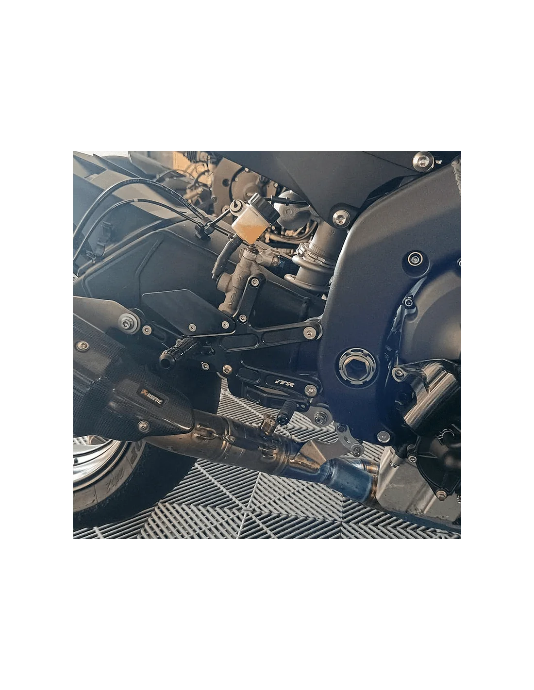 NOTA: * El soporte de sujeción de estribera-escape, para modelos YAMAHA R6 17-24, viene preparado para escape de competición Akrapovic S-Y6R9-APT, S-Y6E9-APT y silencioso S-Y6SO12-HAPT, para el resto puede quedar corto y requerir una pletina a medida. El depósito de líquido de freno trasero, requiere una pletina (SEGUNDA FOTO)