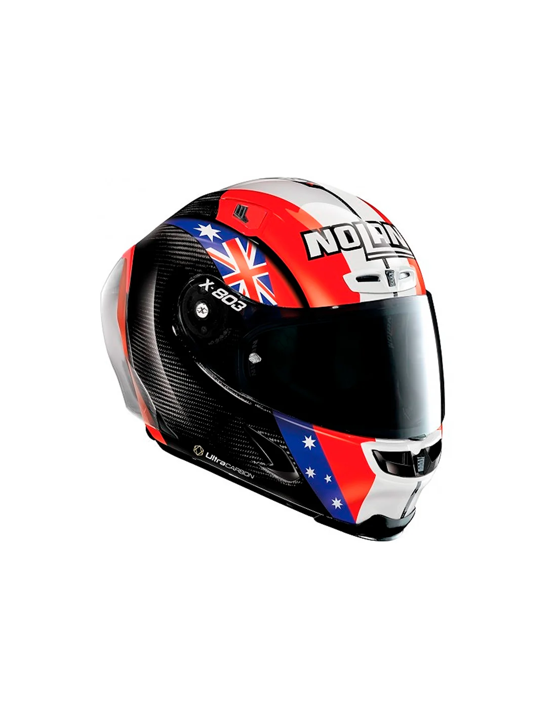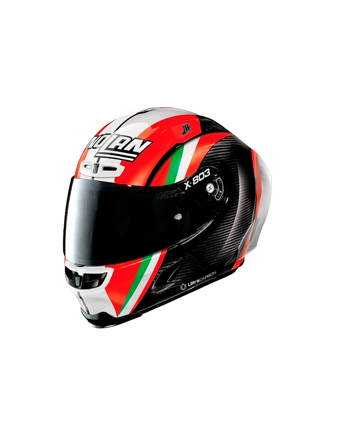 Esta es la nueva versión del casco de carreras con alto contenido de carbono y cara completa de X lite, aquí mejorado con una exclusiva configuración de pista (RS). Está compuesto por una visera verde oscuro adicional en la caja, el Spoiler aerodinámico Racetrack (RAS) y un sistema de ajuste exclusivo para la posición del revestimiento (Control de posicionamiento del revestimiento LPC). Las características técnicas apreciadas y consolidadas del X 803 ULTRA CARBON también están presentes: tamaño compacto y peso reducido (debido al alto contenido de carbono y la disponibilidad de tres tamaños de calota exterior), sistema de extracción de almohadillas de emergencia (Sistema de liberación de emergencia Nlan Nolan) , mecanismo de visera confiable con un sistema de doble acción, eficiente sistema de ventilación RAF (Racing Air Flow) y acolchado de confort interno Carbon Fitting Racing Experience (con una innovadora construcción de red). El X 803 RS ULTRA CARBON se presenta como el casco integral de carreras más exclusivo para motociclistas que desean disfrutar al máximo de su experiencia en la pista de carreras