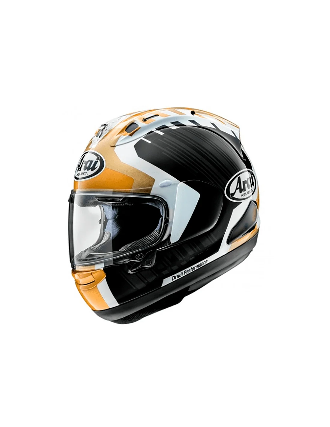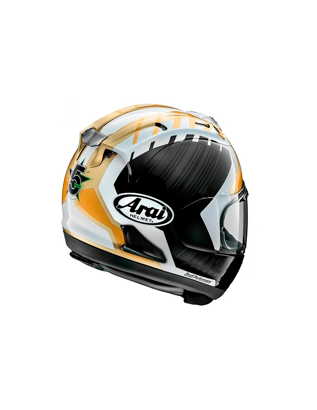 Para celebrar los cinco títulos conseguidos por Jonathan Rea en el Campeonato del Mundo de Superbikes, Arai lanza una versión especial homenaje bajo el nombre de RX-7V Rea - Gold Edition e inspirado en que lleva el piloto de Kawasaki. Como todos los cascos Arai, son hechos a mano y pasan 5 controles de calidad durante todo el proceso de fabricación para asegurar que cada casco que sale de la fábrica tenga el mismo nivel de acabado. La calota exterior tiene la forma redonda habitual en Arai y las ventilaciones y los estabilizadores de aire son flexibles para facilitar su arranque y deslizamiento en caso de caída y para limitar las lesiones en caso de caída. El mecanismo de la visera ha evolucionado gracias a un nuevo sistema más práctico y con menos riesgo de romper una pieza al cambiar de pantalla. Dirigido a los moteros que buscan un producto de primera calidad que garantice la máxima seguridad sin descuidar el confort específico de la marca Arai, firme y agradable al mismo tiempo. Un producto excepcional para moteros excepcionales.