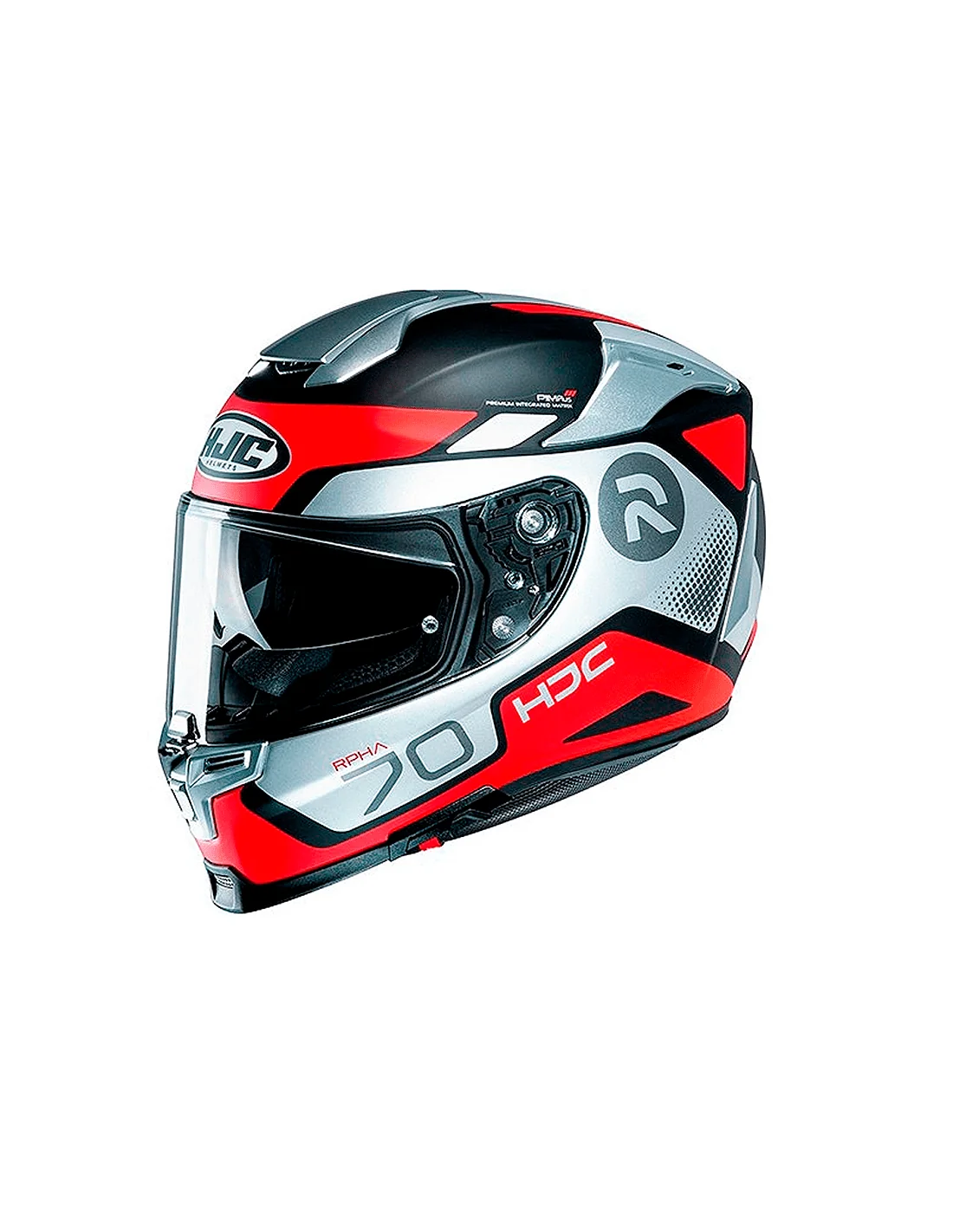 Casco Hjc Rpha 70 Shuky MC1SF (gráfica 2020). Rpha 70 es el nuevo casco integral de Hjc destinado para la conducción sport touring al más alto nivel. Este casco de gama alta ofrece prestaciones muy altas en cuanto a seguridad, confort y ligereza, gracias a los materiales con los que se ha realizado y a su diseño optimizado en el túnel del viento. La calota exterior P.I.M. Plus (Premium Integrated Matrix) reforzada con carbono y fibra híbrida de vidrio-carbono, optimizan la resistencia al impacto y proporcionan un peso muy ligero al Rpha 70. Sus 3 tamaños de calota garantizan un compacto y perfecto dimensionado.