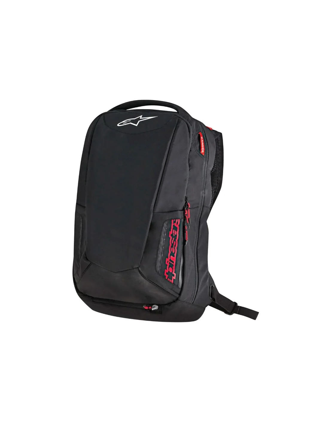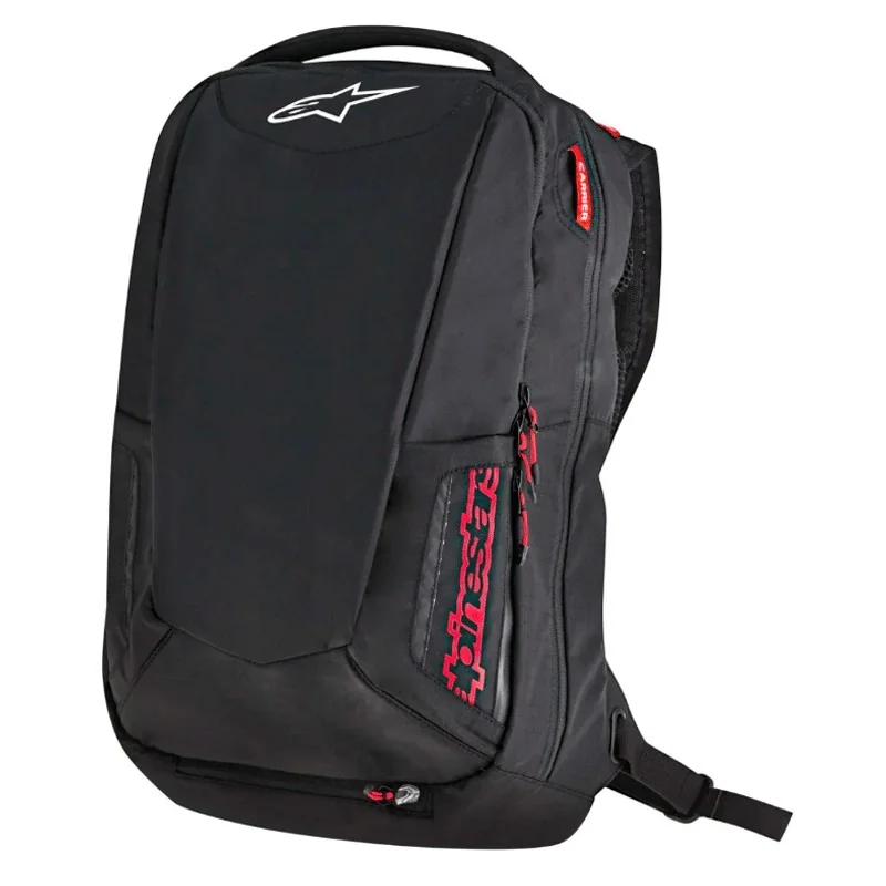 Mochila Alpinestars City Hunter Negra / Roja. Práctica mochila de 25 litros con bolsillos específicos para el portátil y el móvil, porta-cascos integrado y una funda impermeable oculta en el compartimento principal. La City Hunter es perfecta tanto para llevar encima de la moto como para pasear por la ciudad.