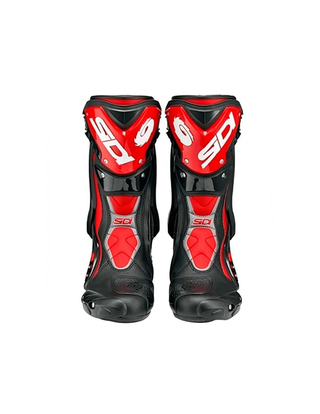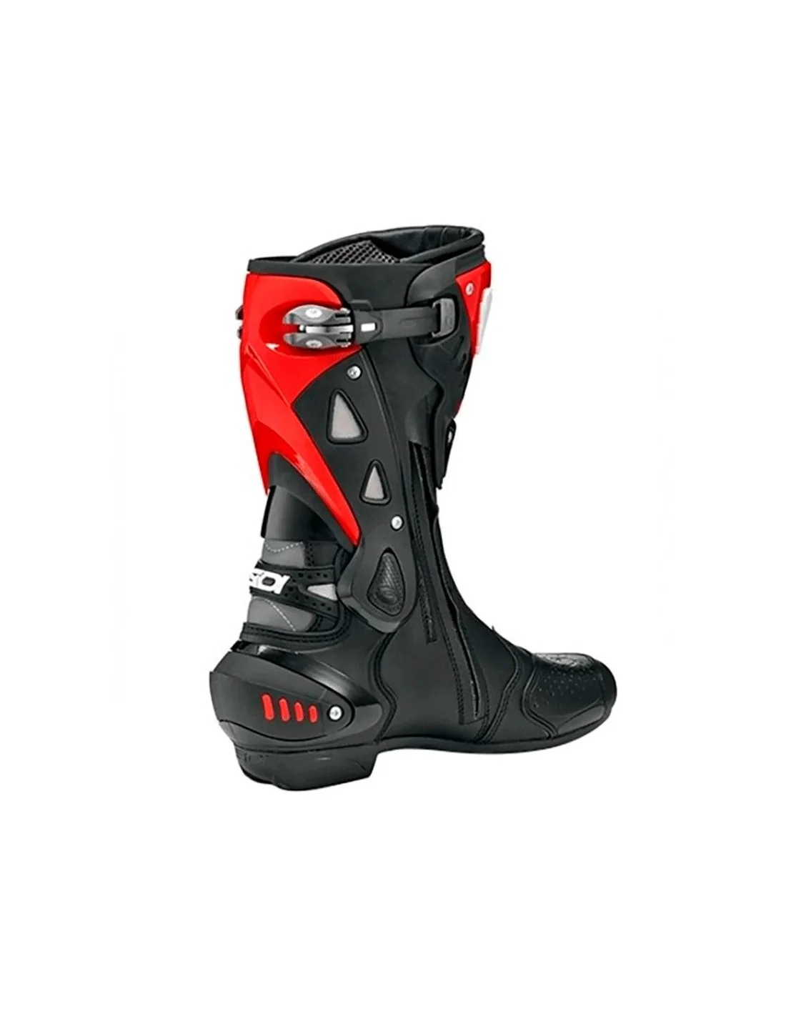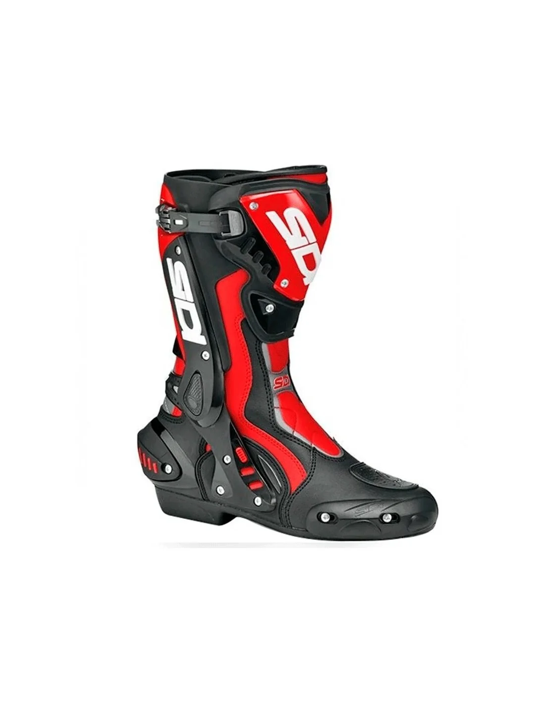 Botas Sidi ST Negro / Rojo. Botas de uso Racing con un diseño agresivo confeccionadas en lorica, material de alta resistencia a los impactos. Su interior está confeccionado en teflón perforado que aporta mayor comodidad. Ventilación accionable en la zona lateral y frontal de la deslizadera. Protecciones en la zona del tobillo para ofrecer mayor seguridad. Deslizaderas reemplazables. Plantilla de nylon y suela de goma que permite un alto nivel de agarre. Cierre con cremallera y dos hebillas laterales.