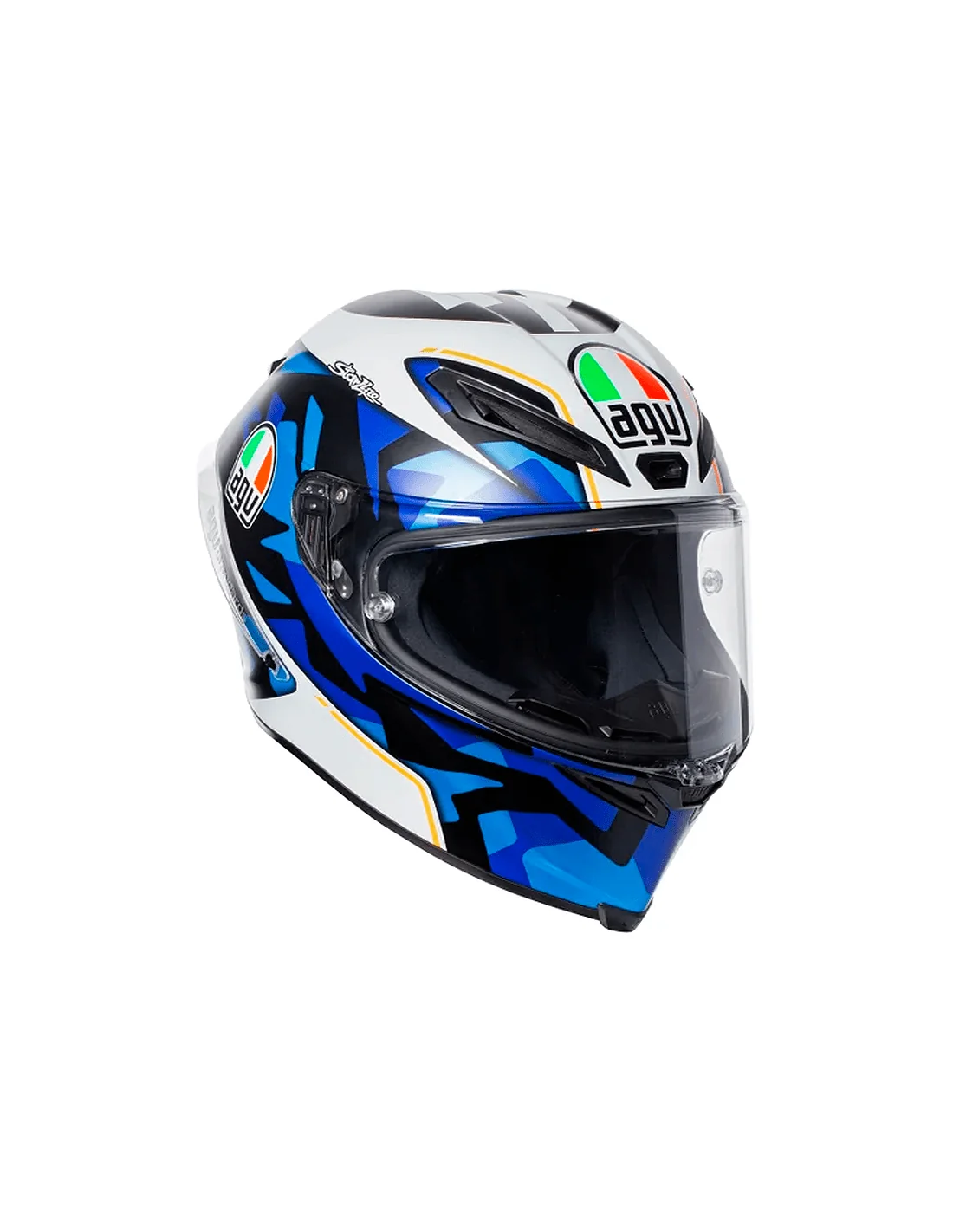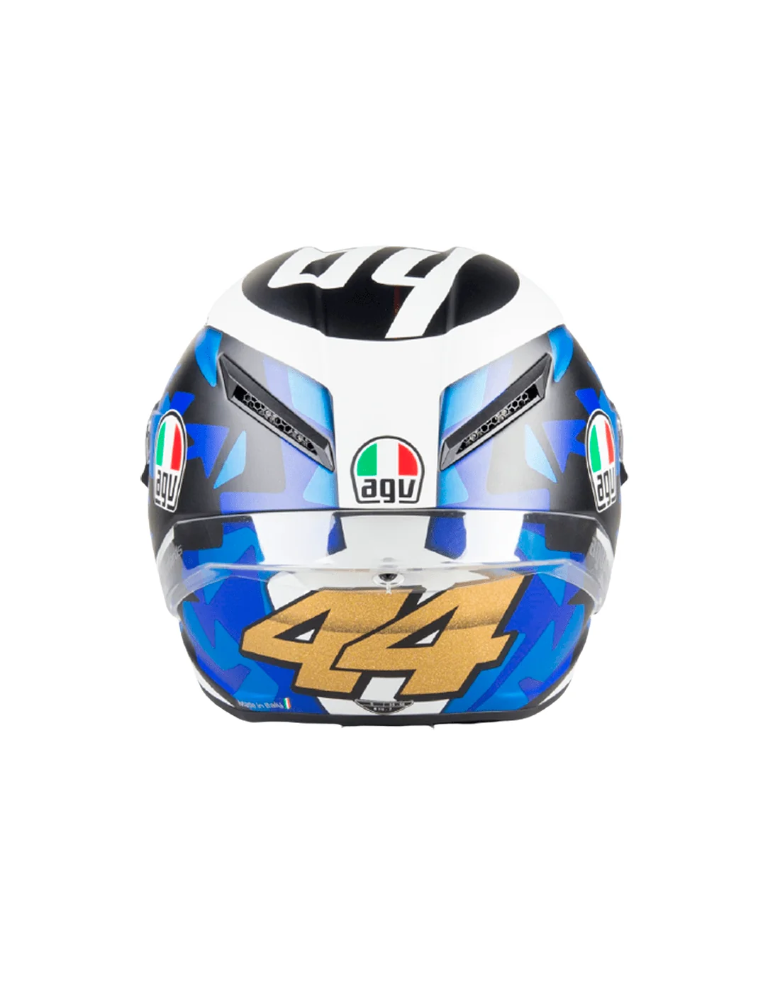 La forma del casco ha sido diseñada para favorecer la eficiencia aerodinámica y para minimizar el riesgo de que la energía generada por un eventual impacto se transmita a la zona de la clavícula. Las líneas de la parte trasera minimizan la interferencia con el mono de competición cuando el piloto está acoplado a la moto.