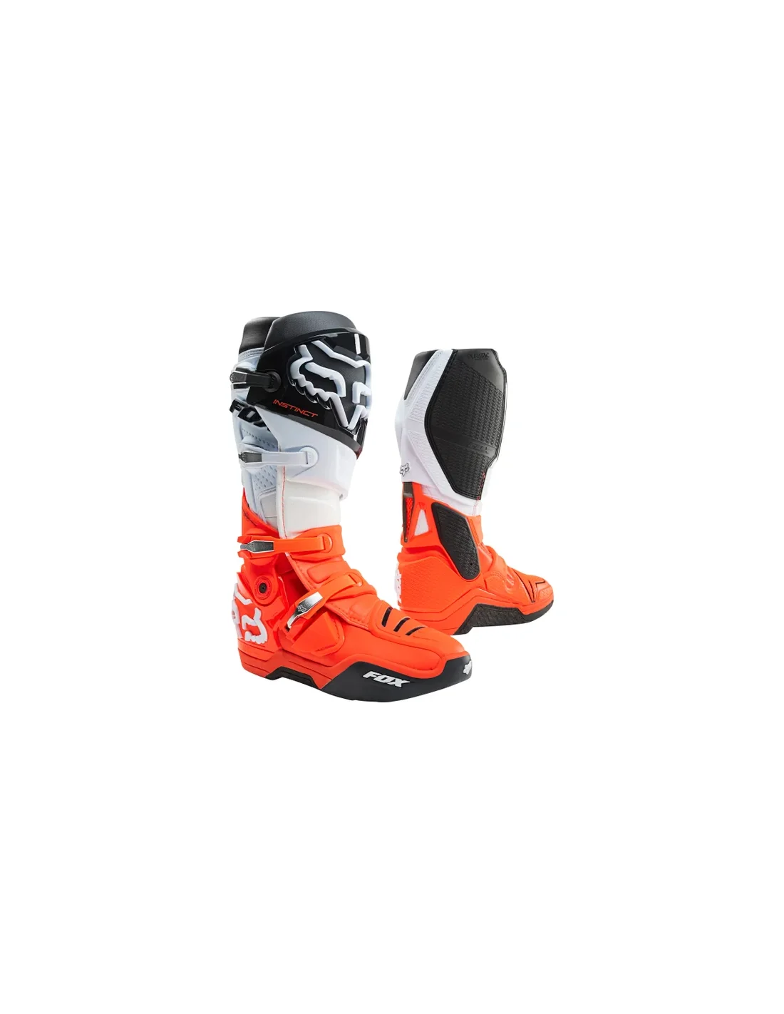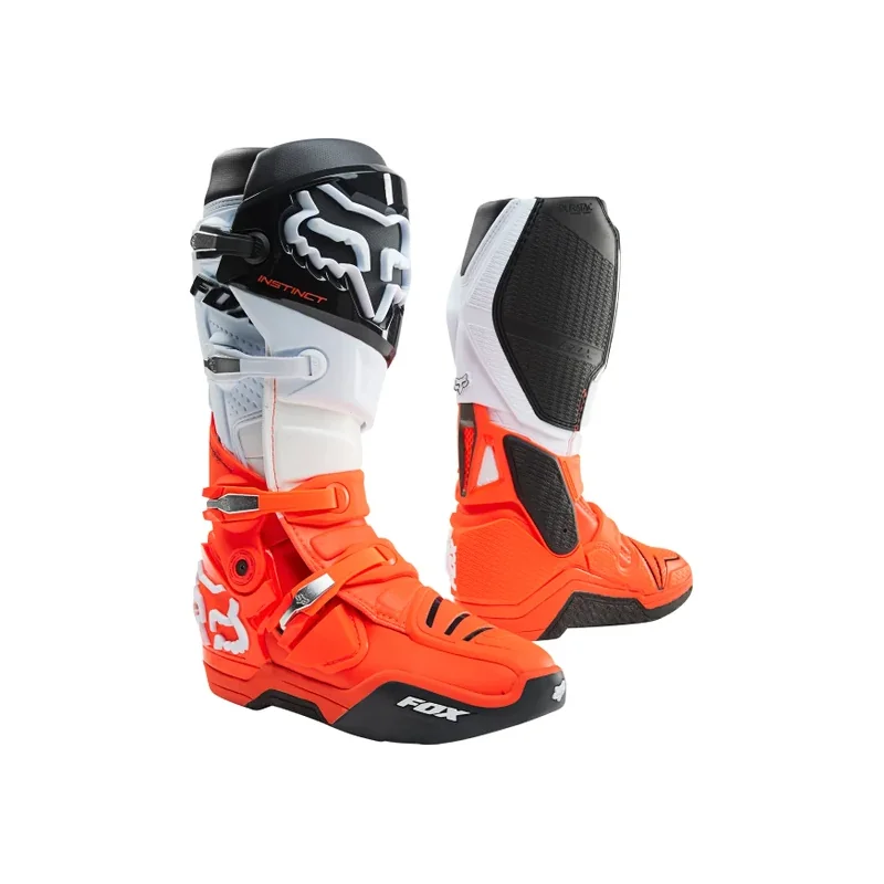 Botas Fox Instinct Negras / Blancas / Naranjas. Las botas Fox Instinct son el resultado del desarrollo realizado por el piloto de pruebas más rápido del mundo, Ricky Carmichael, y por los mejores pilotos de Supercross y Motocross de la marca. Las Fox Instinct han ganado carreras y campeonatos mucho antes de haberse vendido un solo par. Desde el primer momento ofrecen un gran confort y una gran libertad de movimientos, permitiendo al piloto concentrarse en la conducción de la moto.