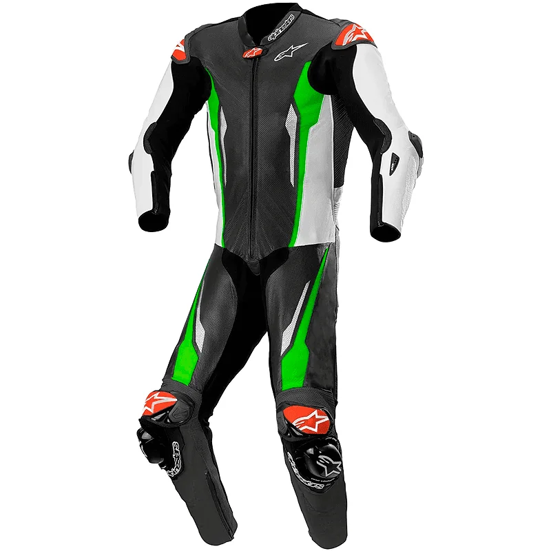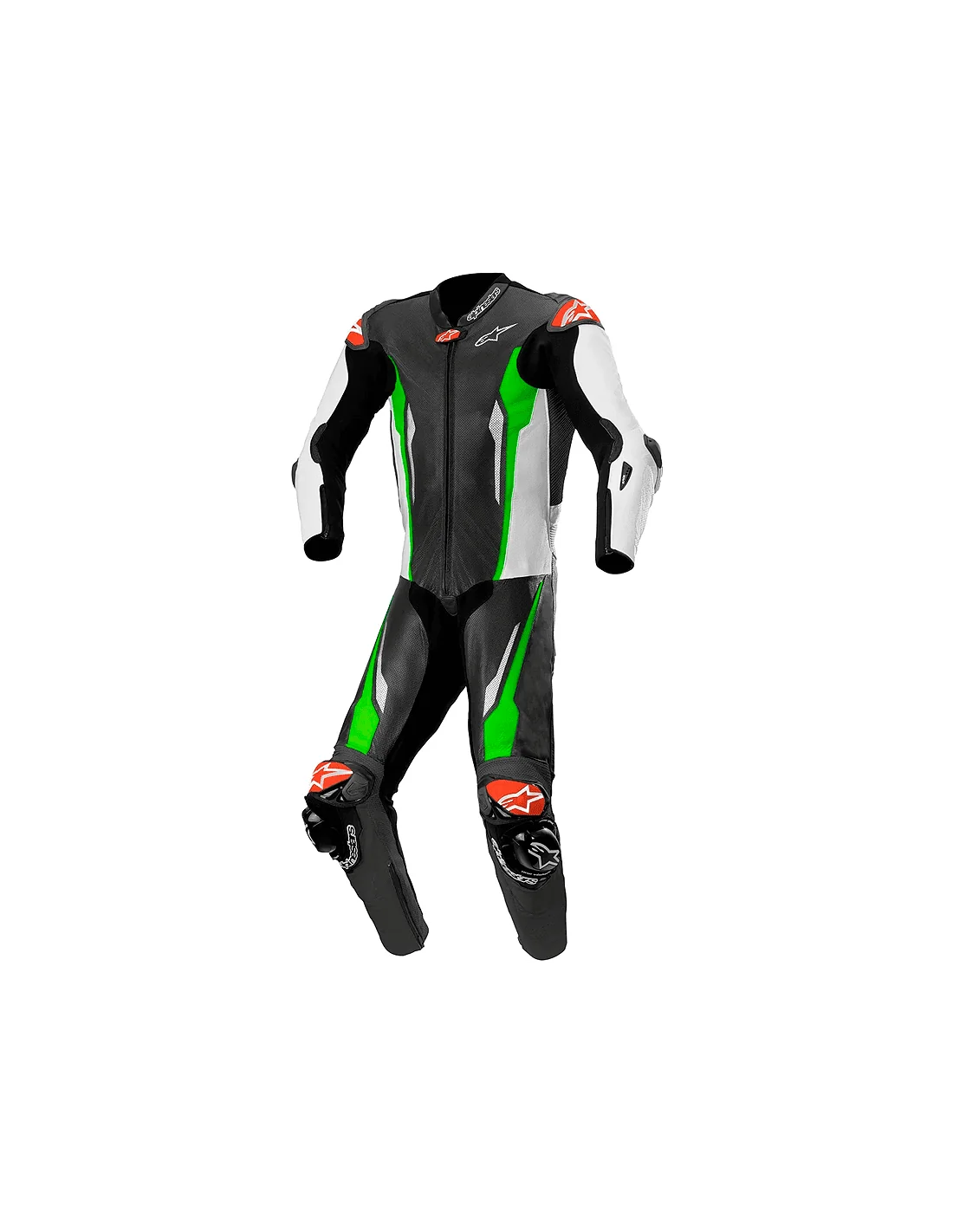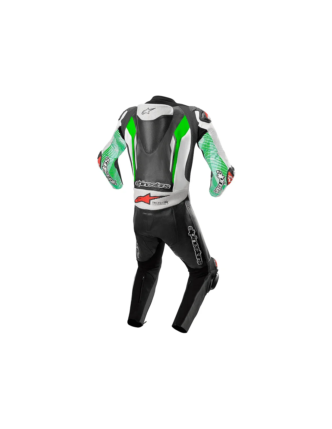 El traje de cuero Racing Absolute utiliza las lecciones aprendidas del Campeonato del Mundo de MotoGP y las aportaciones de los atletas de Alpinestars para crear un traje de carreras de última generación que establece nuevos puntos de referencia para la tecnología de protección disponible para los ciclistas. Un ejemplo de esto es el nuevo e innovador cuero de aramida que se encuentra en las áreas del traje propensas a la abrasión; los hombros, las rodillas, los codos, el antebrazo, el asiento y los lados de la espalda tienen esta capa adicional de protección junto con capas de cuero doble. Se ha demostrado que esta unión aramídica aumenta significativamente la resistencia al desgarro y la abrasión, al tiempo que protege al ciclista de la transferencia de calor, particularmente en el caso de un deslizamiento largo en la pista. El cuerpo mapeado para brindar un ajuste completo en las carreras, el Racing Absolute está hecho de cuero de canguro de primera calidad de 1,1 mm para altos niveles de resistencia a la abrasión.