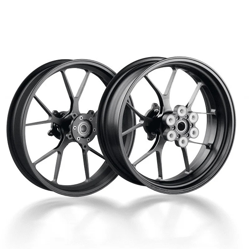 El proceso de fabricación de múltiples pasos de las llantas TITAX comienza con una sola pieza sólida de aluminio aeroespacial de alta calidad. Luego, se utiliza forja a alta presión (30 mil toneladas) para mejorar aún más la estructura del grano. Esta forja de alta presión es la única forma de crear el producto terminado más fuerte y rígido. Los espacios en blanco forjados se mecanizan luego en fresadoras controladas numéricamente por computadora (CNC) para garantizar que las superficies de los cojinetes, etc., sean perfectamente verdaderas. Para la rueda trasera partimos de una pieza de aluminio forjado de 25 kg, para la delantera 15 kg. Cuando finaliza todo el proceso, el peso de la rueda trasera (17 * 5,5) es de 4,6 kg (Moto2 totalmente equipado Tipo 1.01) y la rueda delantera es de solo 2,75 kg (Moto2 totalmente equipado Tipo 1.01)!! En total, ofrece un ahorro de peso de más de 3,8 - 7,2 kg en comparación con las ruedas OEM según el modelo. El peso de carga de las ruedas estáticas en la rueda delantera es de 295 kg, en la rueda trasera de 375 kg. Está disponible en estos colores plata, negro, dorado, rojo, azul, verde, naranja, blanco, titanio y antracita.