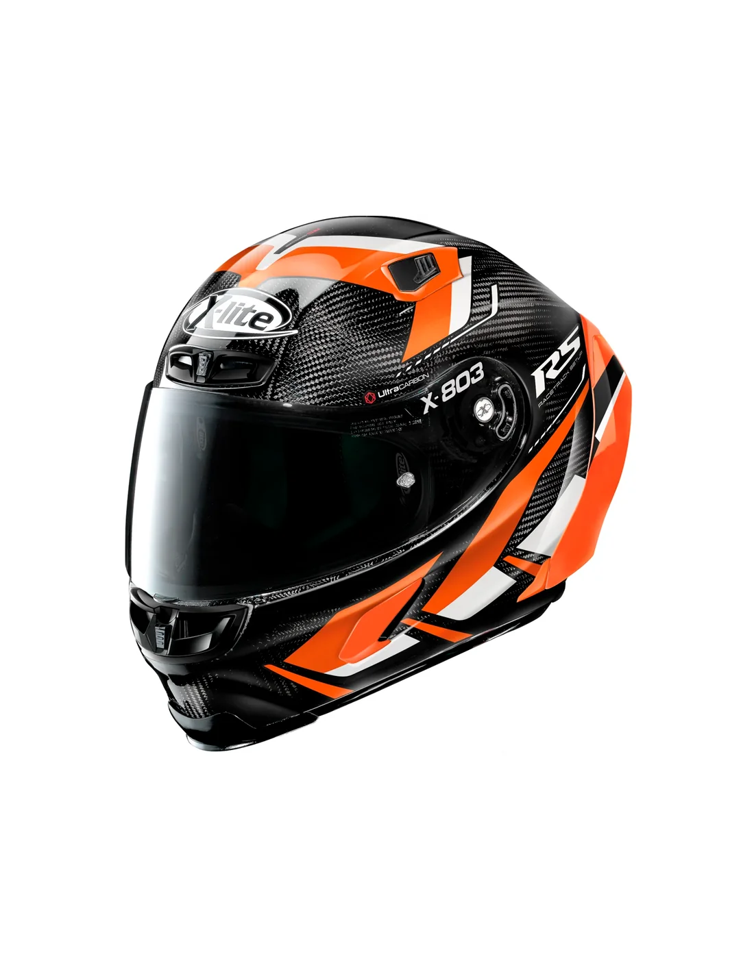 El nuevo X-LITE X-803 RS ULTRA CARBON es una nueva versión del conocido X-803, pero más enfocado a circuito gracias a su configuración "Racetrack Setup" que incorpora un nuevo alerón trasero de mayor tamaño (desmontable). Su calota está fabricada en fibra de carbono, muy ligera y resistente, y cuenta con 3 tamaños de calota para un mejor ajuste y un tamaño más compacto. Se trata del casco top de gama fruto de la experiencia de NolanGroup en los más altos niveles de competición (MotoGP y SBK). Destaca por ser muy compacto y ligero.