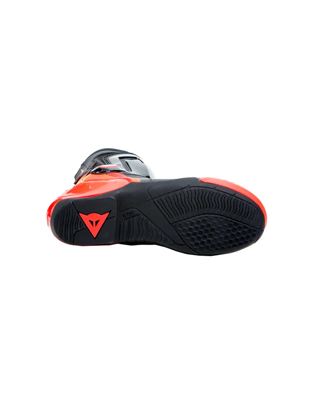 Botas deportivas para moto con sistema Axial Distorsion Control System para la protección del tobillo y deslizadores termoplásticos reemplazables.