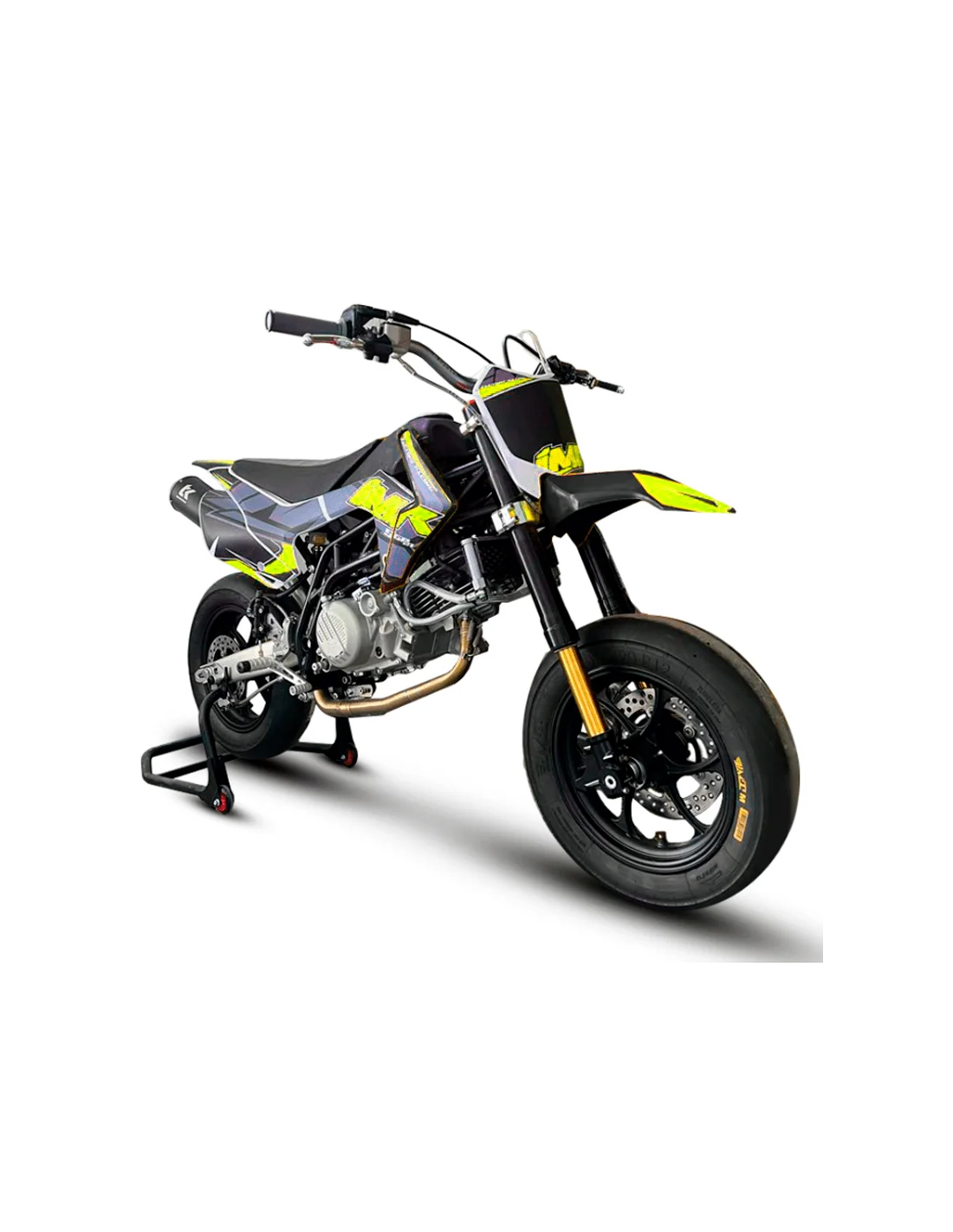 La Pit Bike que esperabas ya está aquí. Disfruta su motor de 4 tiempos y 190cc con potencia de 20cv. Equipada con chasis tubular de cromo Molibdeno y basculante de aluminio desarrollado con sistema de bieletas, su estabilidad en el paso por curva es una pasada. Horquillas MIR Racing regulables en comprensión y extensión, tijas modelo MIR Racing de CNC y amortiguación trasera DNM. Freno delantero (bomba y pinza) modelo Fórmula con disco flotante MIR Racing de 220mm. Freno trasero con disco MIR Racing de 180mm. Llantas ultraligeras de 12 pulgadas color negro. Altura del suelo al asiento de 750mm.