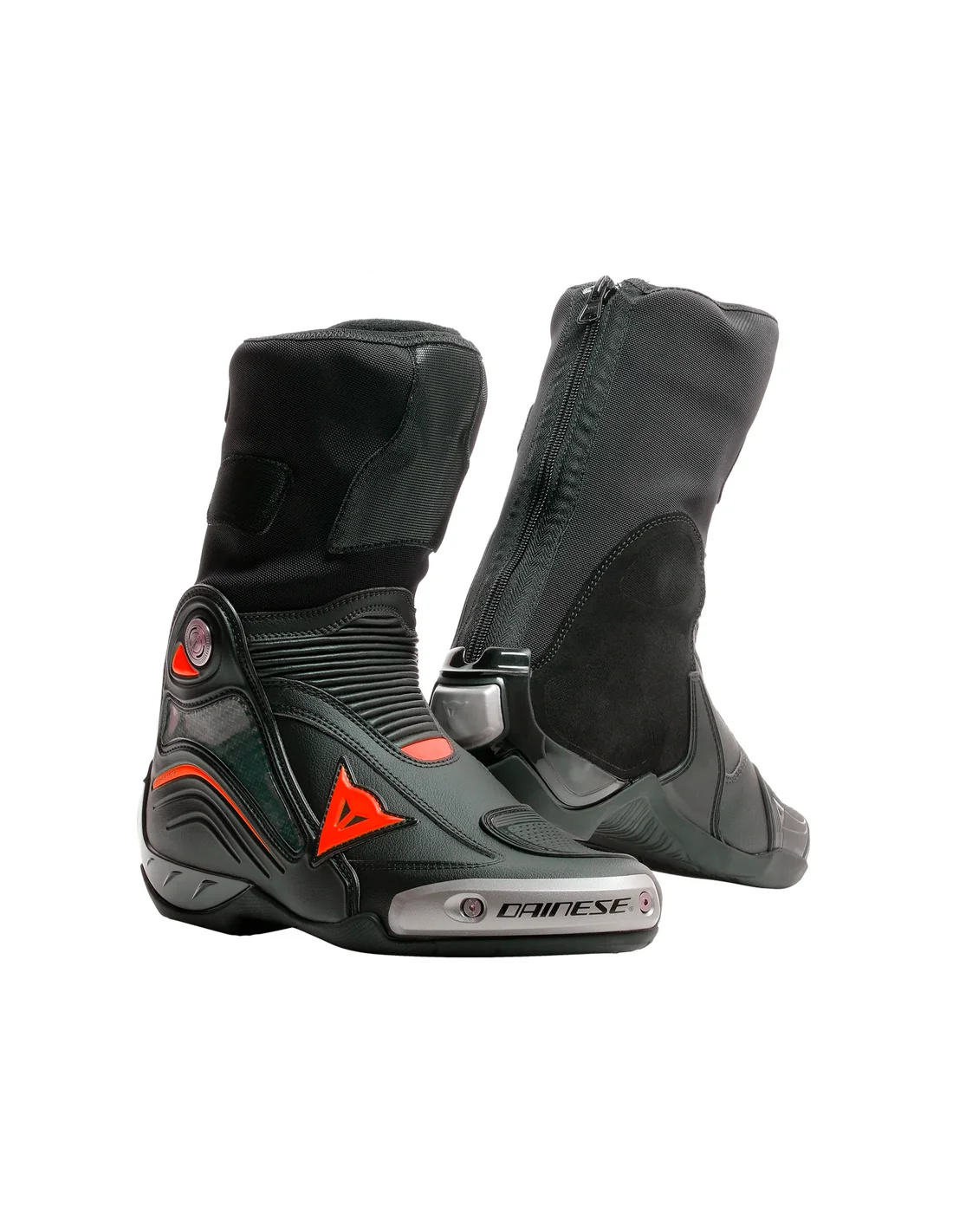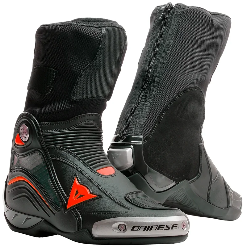 Botas Dainese Axial D1 Negras / Rojas Fluo. Dainese evoluciona su bota más deportiva y dota a la Axial D1 de los últimos avances tecnológicos. Destacan por incorporar un nuevo sistema de enganche mono-bota en velcro y una protección del cambio totalmente evolucionada más ergonómica. Las Axial D1 representan el máximo nivel de la tecnología y de la experiencia de Dainese en competición aplicada a una bota, para ofrecer al piloto lo mejor a nivel de seguridad, comodidad y funcionalidad durante la conducción.