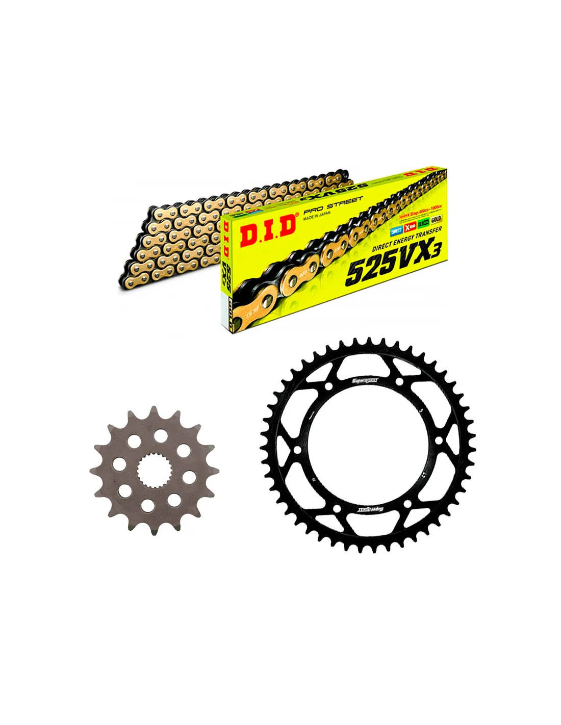 Los kit de transmisión están compuestos por cadena DID fabricante Japonés que suministra a equipos de MOTO GP, SBK, MotoAmerica y distribuidor por todo el mundo. Piñón y corona SUPERSPROX también presentes en distintos campeonatos como SBK y en motos de producción.