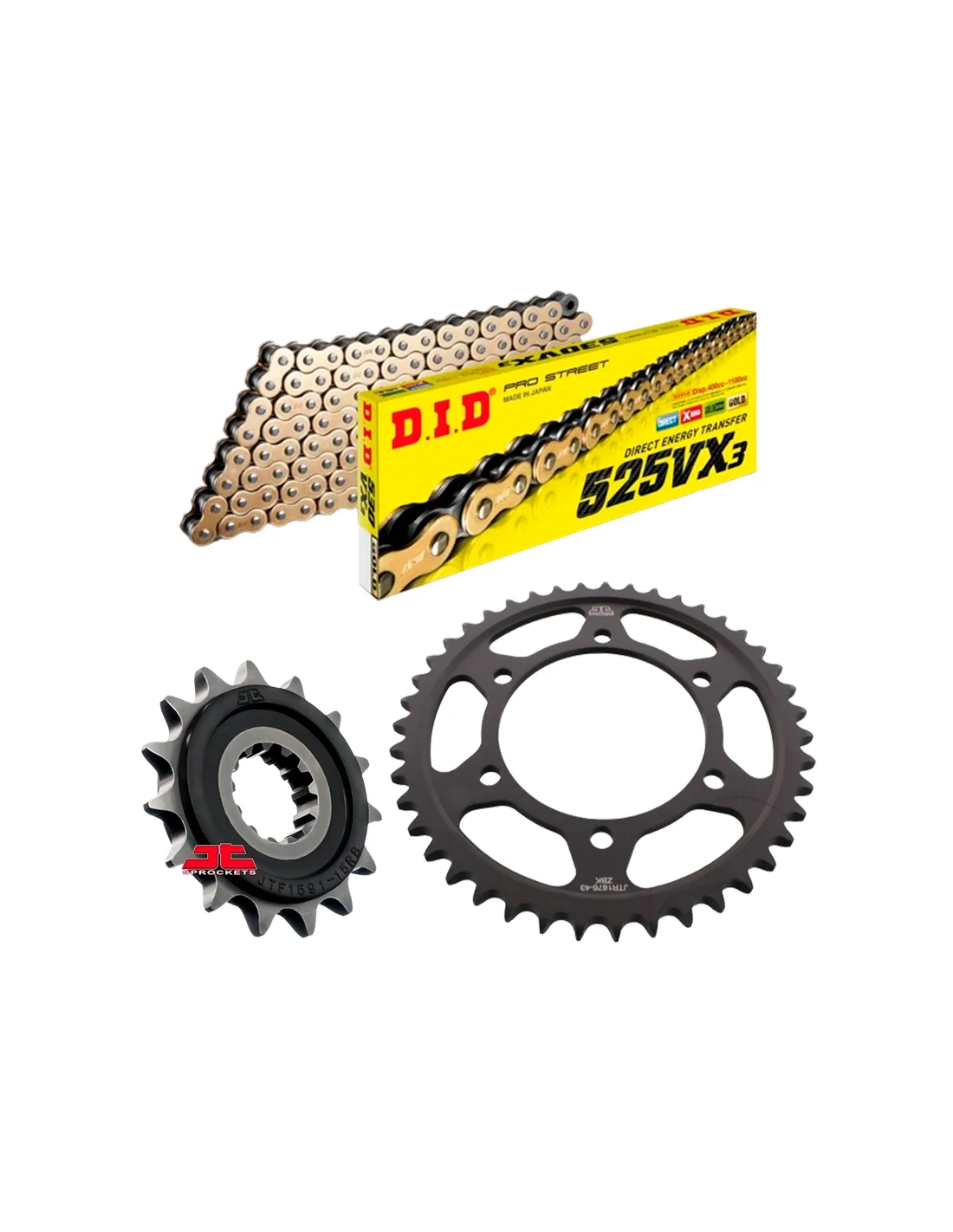 Los kit de transmisión están compuestos por cadena DID fabricante Japones que suministra a equipos de MOTO GP, SBK, MotoAmerica y distribuidor por todo el mundo. Piñón y corona SUPERSPROX también presentes en distintos campeonatos como SBK y en motos de producción.