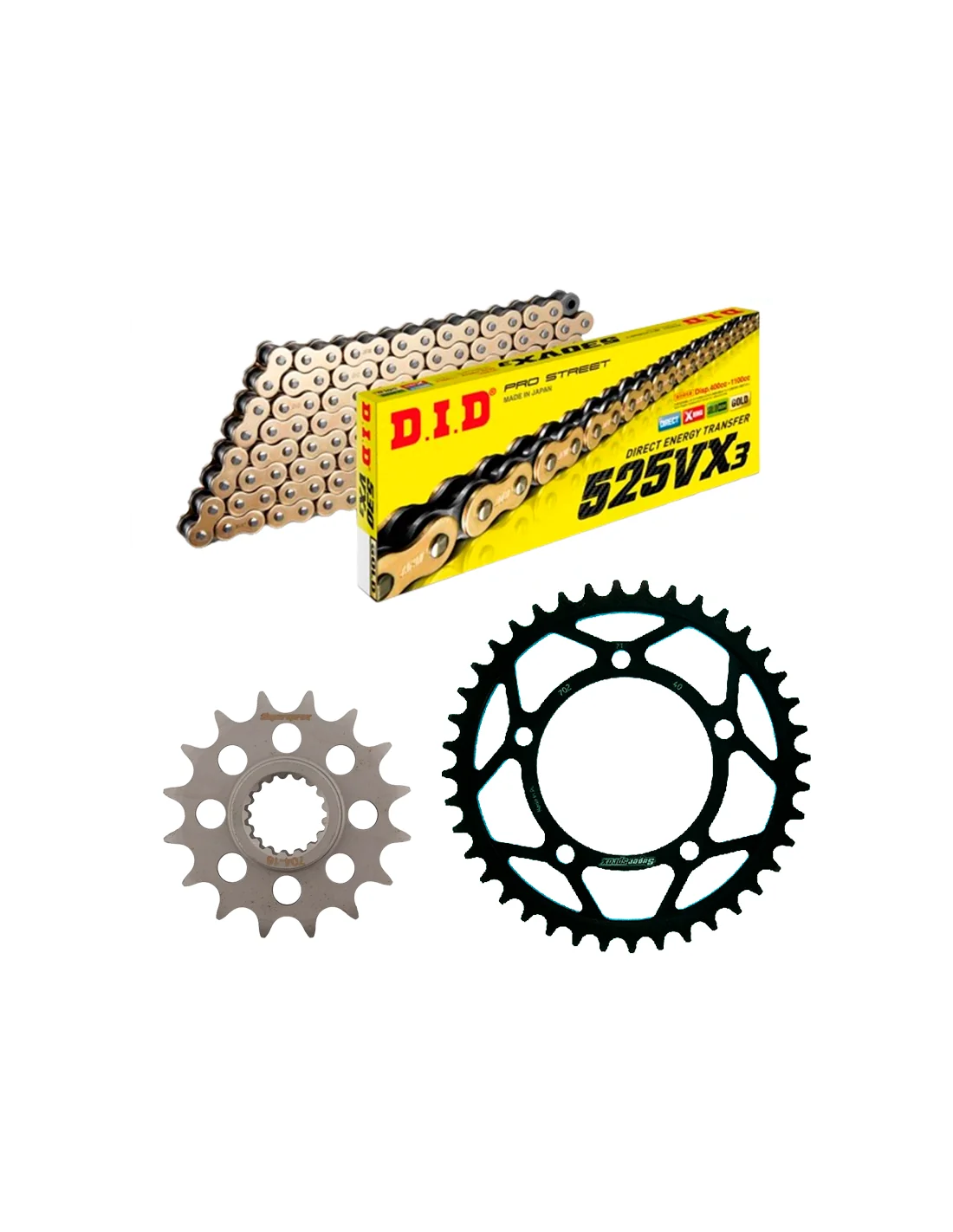 Los kit de transmisión están compuestos por cadena DID fabricante Japones que suministra a equipos de MOTO GP, SBK, MotoAmerica y distribuidor por todo el mundo. Piñón y corona SUPERSPROX también presentes en distintos campeonatos como SBK y en motos de producción.
