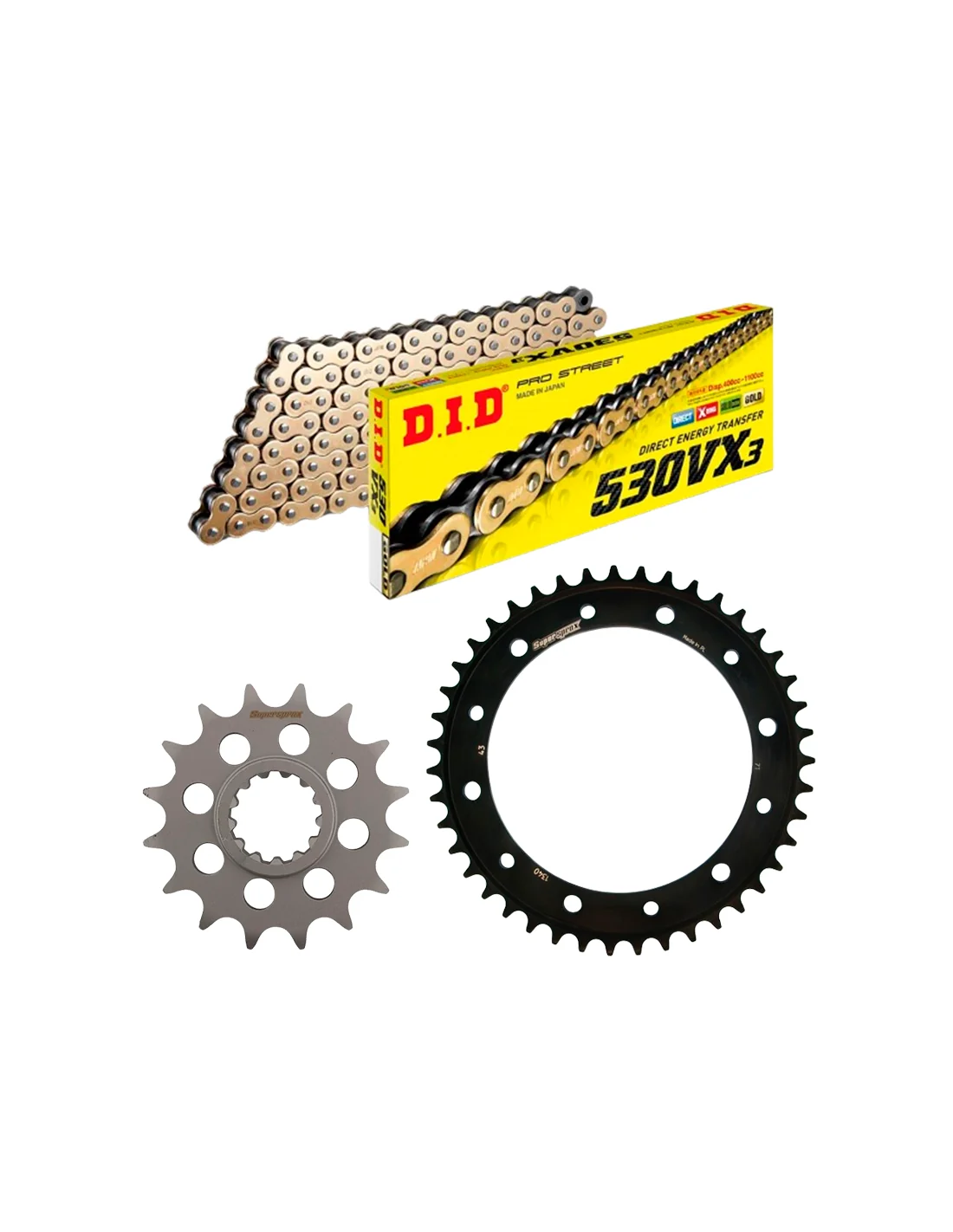 Los kit de transmisión están compuestos por cadena DID fabricante Japones que suministra a equipos de MOTO GP, SBK, MotoAmerica y distribuidor por todo el mundo. Piñón y corona SUPERSPROX también presentes en distintos campeonatos como SBK y en motos de producción.