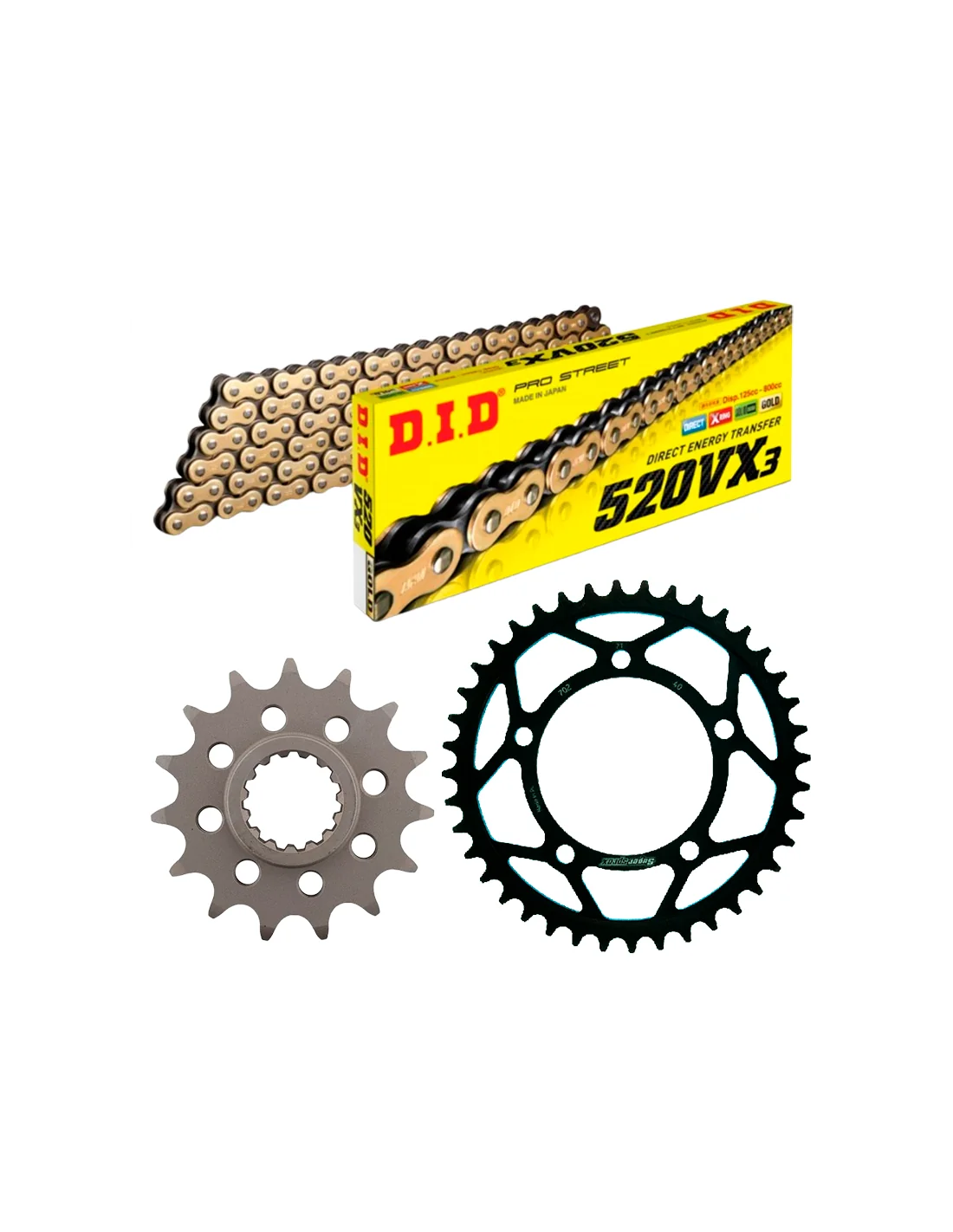 Los kit de transmisión están compuestos por cadena DID fabricante Japones que suministra a equipos de MOTO GP, SBK, MotoAmerica y distribuidor por todo el mundo. Piñón y corona SUPERSPROX también presentes en distintos campeonatos como SBK y en motos de producción.