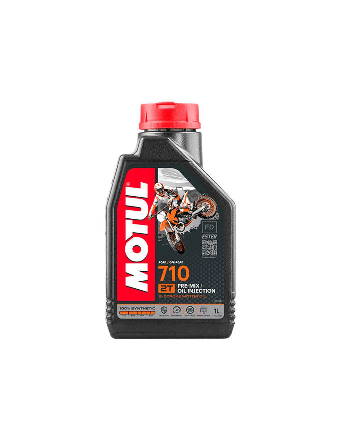 Motul 710 2T es un lubricante 100% sintético con tecnología de ésteres, estudiado para responder a los modernos motores de 2T, con elevados regímenes de rotación, manteniendo una firme película de lubricación que protege contra el desgaste. Incremento de potencia del motor por reducción de la fricción.