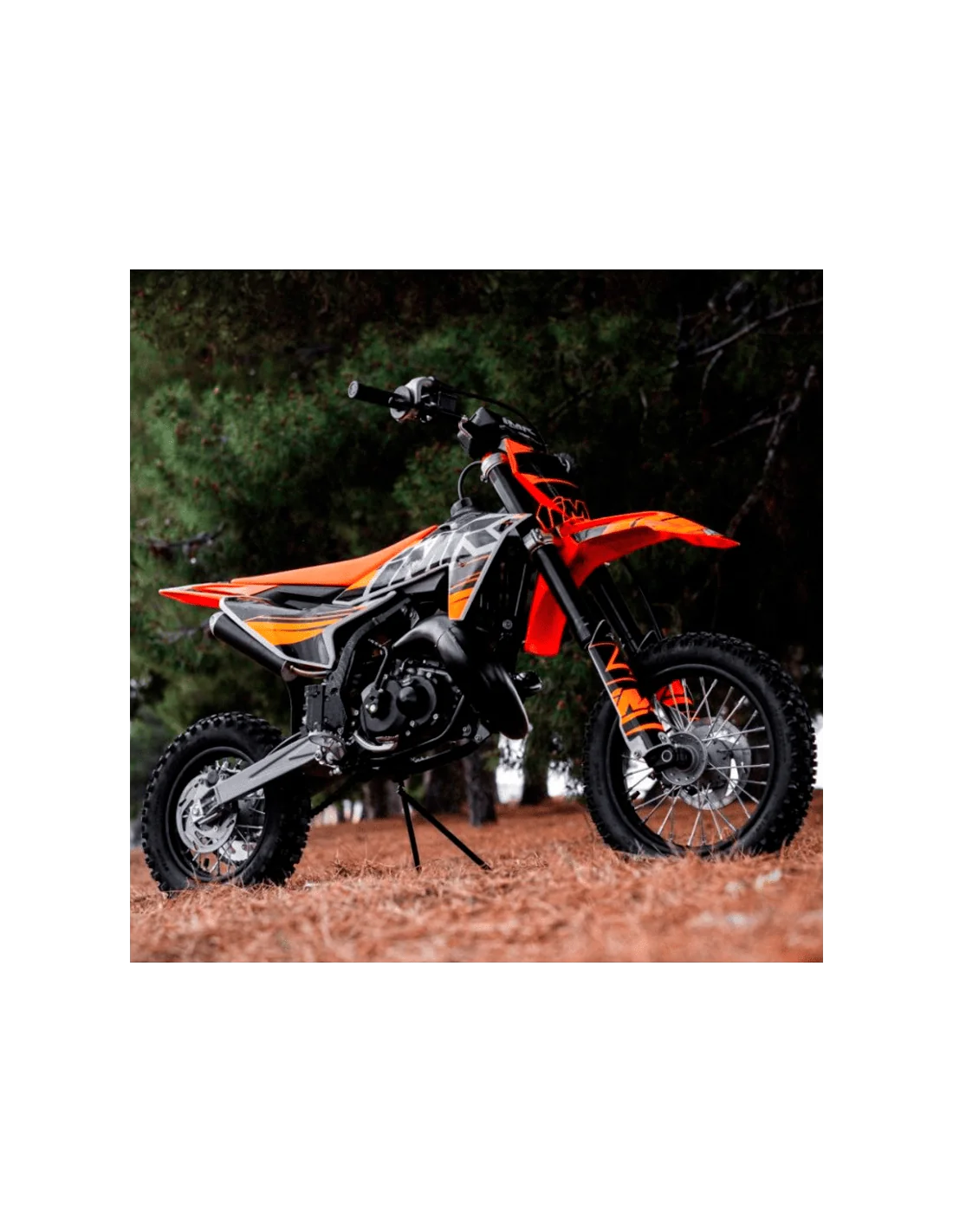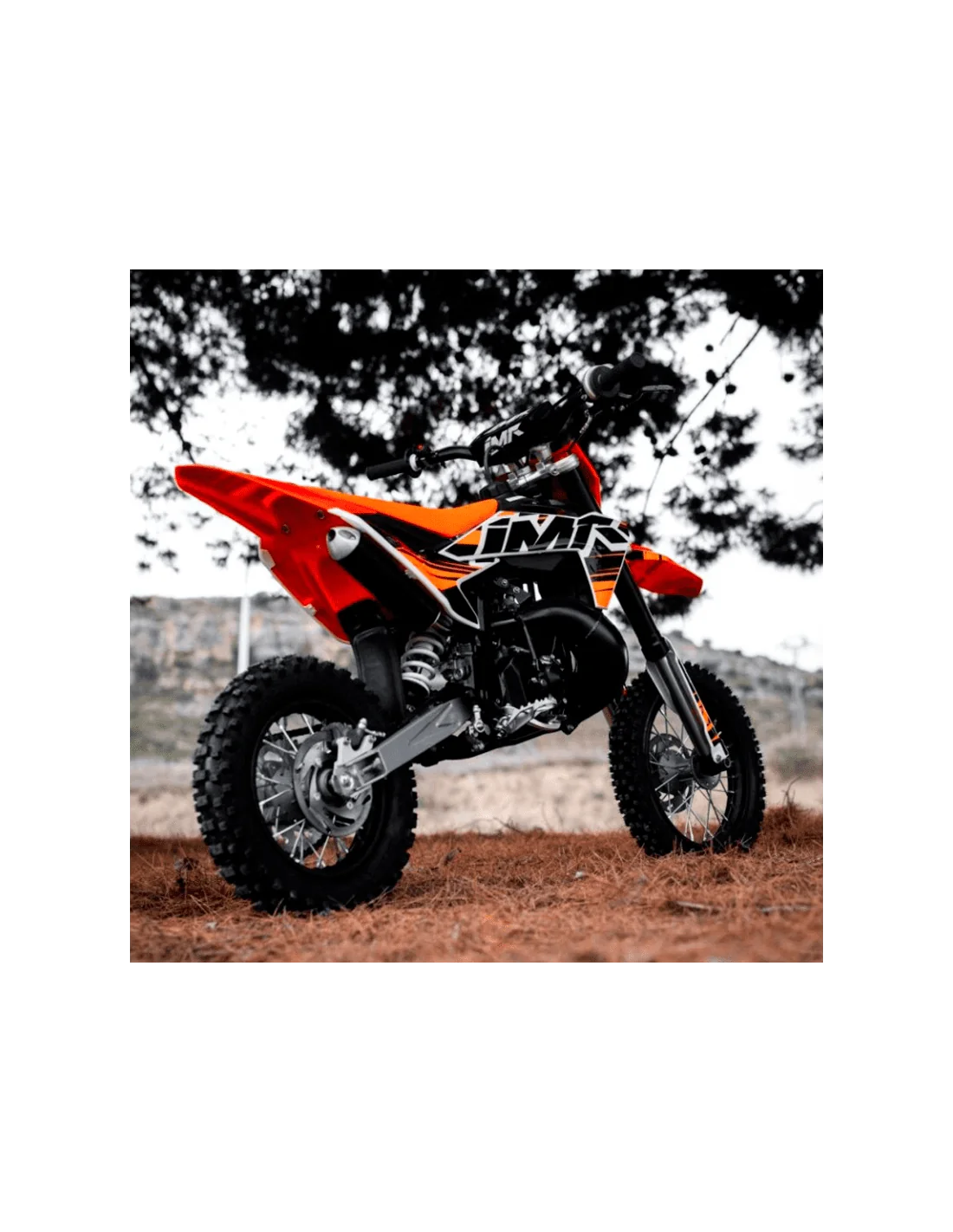 ¡Espectacular Replica KTM 50 (RACING FACTORY) de la mano de IMR! Disfruta su de motor 2 tiempos y 50cc con 9cv de potencia, cambio automático y arranque por patada. Ideal para jóvenes pilotos que buscan potencia y facilidad desde el primer momento.