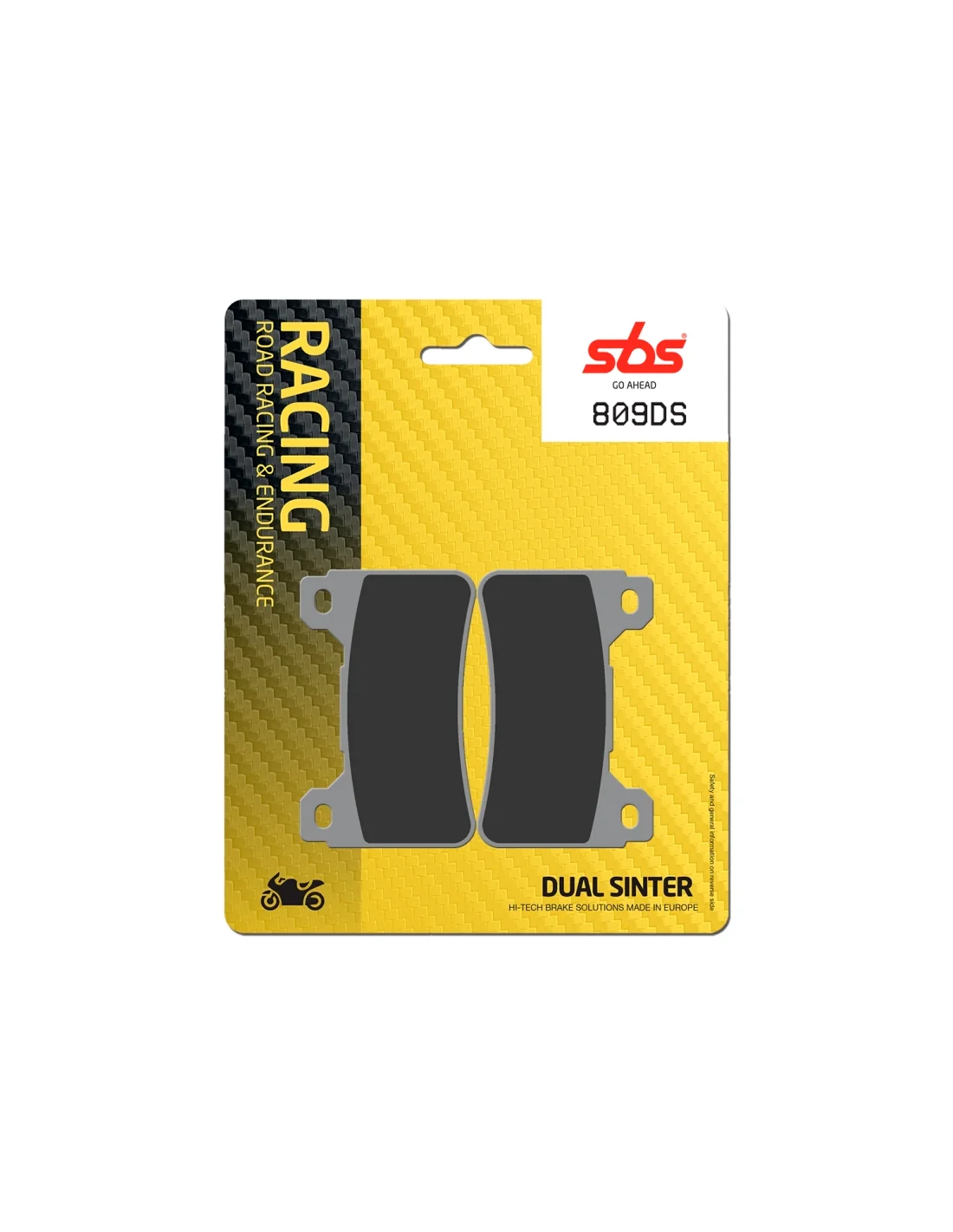 Las pastillas de freno SBS P809-DS DUAL SINTER tiene en su haber varios títulos mundiales y campeonatos nacionales. Las Pastillas de Freno Dual Carbón (DS), con sus nuevos compuestos, nos transmiten una buena mordida inicial, con una mejora constaste en el rendimiento y una mayor durabilidad. Este compuesto de carbono ofrece su máximo rendimiento a altas temperaturas de trabajo, por eso son recomendadas para uso en circuito. Son las favoritas de los pilotos gracias a su gran desarrollo y a la experiencia obtenida en los mundiales de Superbike y en la nueva clase de Moto 2.