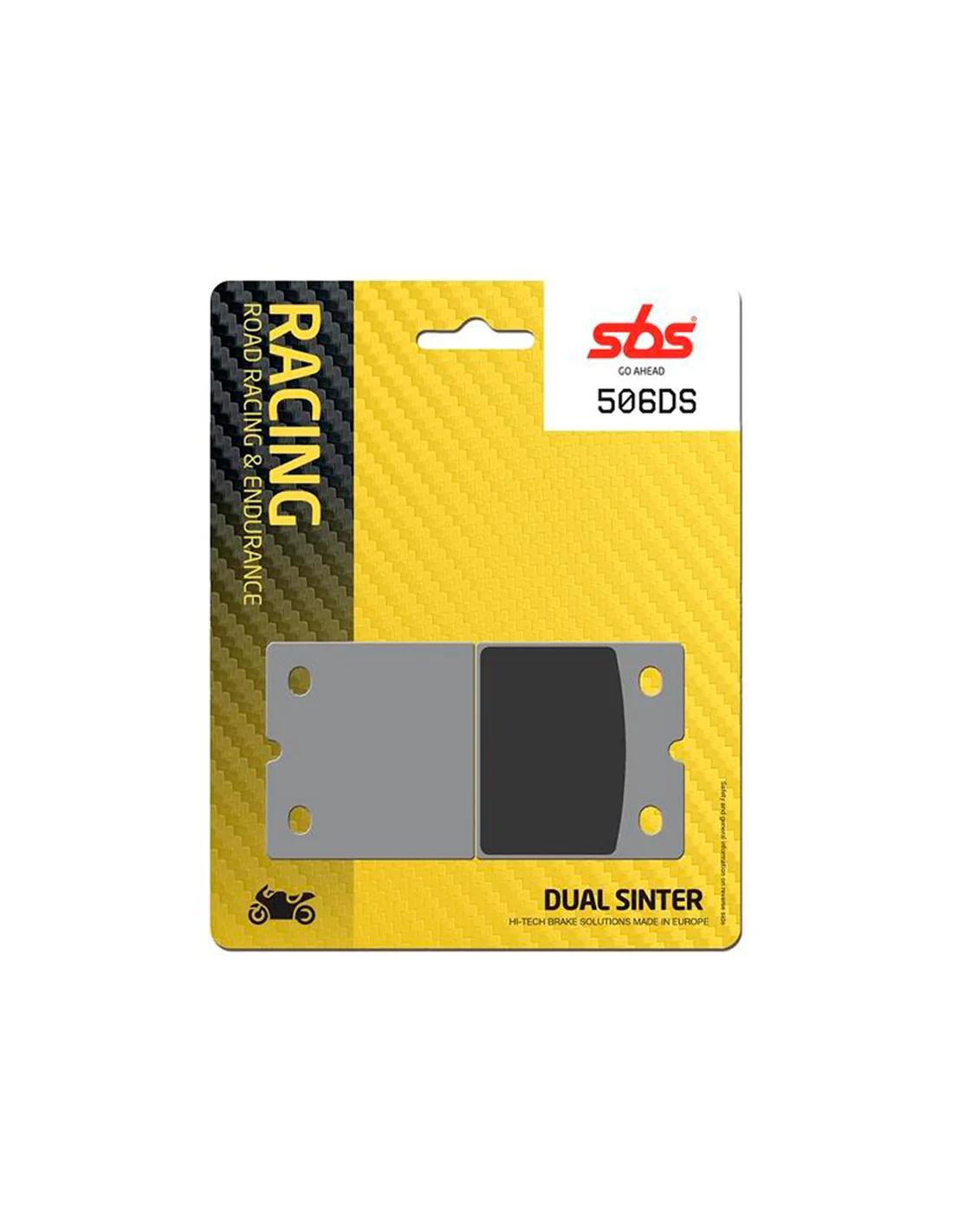 Las pastillas de freno SBS P506-DS2 DUAL SINTER tiene en su haber varios títulos mundiales y campeonatos nacionales. Las Pastillas de Freno Dual Sinter (DS), con sus nuevos compuestos, nos transmiten una buena mordida inicial, con una mejora constaste en el rendimiento y una mayor durabilidad. Este compuesto de carbono ofrece su máximo rendimiento a altas temperaturas de trabajo, por eso son recomendadas para uso en circuito. Son las favoritas de los pilotos gracias a su gran desarrollo y a la experiencia obtenida en los mundiales de Superbike y en la nueva clase de Moto 2.