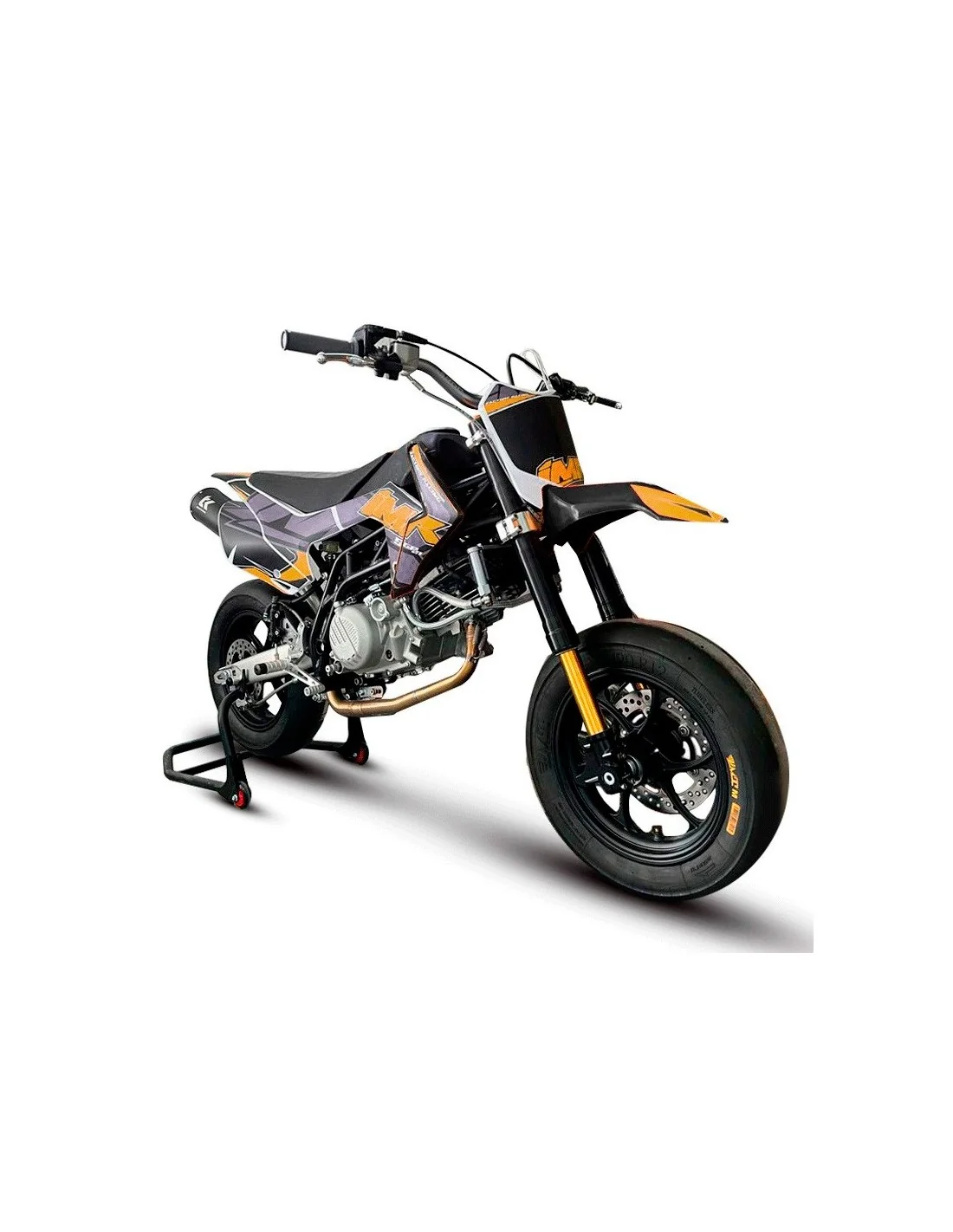 La joya de la corona del mundo Pit Bike con motor Daytona de 4 tiempos y 190cc. !Potencia de 24cv! Chasis tubular de cromo molibdeno con basculante de aluminio desarrollado con sistema de bieletas, su estabilidad en el paso por curva te sorpenderá. Equipada con horquillas MIR Racing regulables en compresión y extensión. Tijas modelo MIR Racing de CNC. Amortiguación trasera DNM. Freno delantero con bomba y pinza modelo Fórmula con disco flotante MIR Racing de 220mm. Freno trasero con disco modelo MIR Racing de 180mm. Incluye llantas ultraligeras modelo IMR de 12 pulgadas color negro. Tensores de cadena GP. Altura del asiento al suelo de 750mm