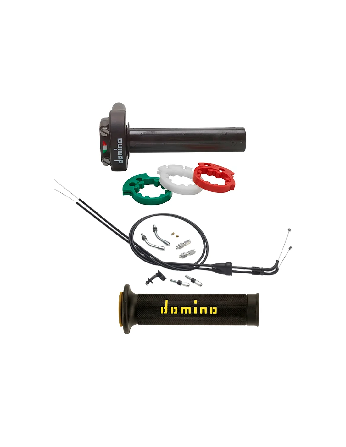 Puño de gas rápido DOMINO XM2, Kit compuesto por caña de gas, 3 coronas para regular el recorrido del cable, dos puños de goma Domino Soft y cableado universal. Válido para todas las motocicletas. SELECCIONA EL COLOR DE LA CAÑA DE GAS Y EL COLOR DE LAS LETRAS DOMINO PUÑO DE GOMA EN EL MENÚ DESPLEGABLE.