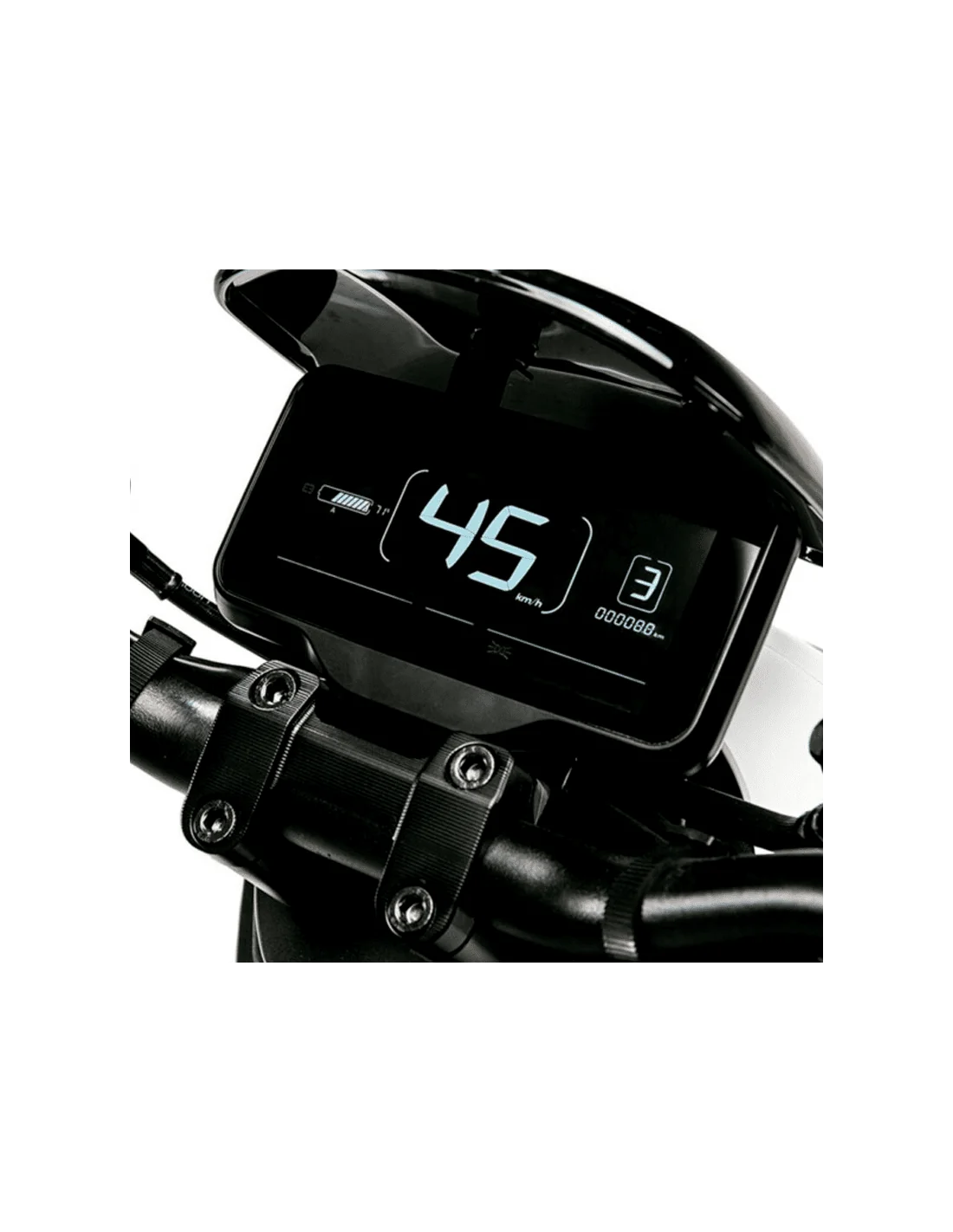 Ciclomotor eléctrico moderno y con gran autonomía, con sistema de iluminación LED, motor BOSCH, con baterías SAMSUNG portátiles de iones de litio (celdas 18650) y frenos de disco delanteros y traseros. IMR ELECTRIC ES5 es impulsado por un potente motor de cubo de rueda sin escobillas de 3000 W sin mantenimiento de Bosch. Un controlador FOC (Field-Oriented Control) toma el control, lo que garantiza una experiencia de conducción óptima. Este scooter eléctrico alcanza la velocidad máxima legalmente prescrita de 45 km/h sin ningún problema y silenciosamente. Con el mando a distancia incluido en el ciclomotor, no solo se puede activar el sistema de alarma y el dispositivo antirrobo, sino que también se puede poner en marcha el scooter eléctrico mediante la función de arranque remoto. Simplemente presione el control remoto y podrá sentarse y arrancar. Con el sistema de alarma activado, suena una sirena si se intenta robar y la llanta trasera quedará bloqueada evitando que el vehículo pueda ser empujado. El ES5 también tiene conexión USB y una interfaz Bluetooth a través de la cual se puede controlar el altavoz integrado, para reproducir música, hablar por teléfono o seguir las indicaciones de Google Maps.