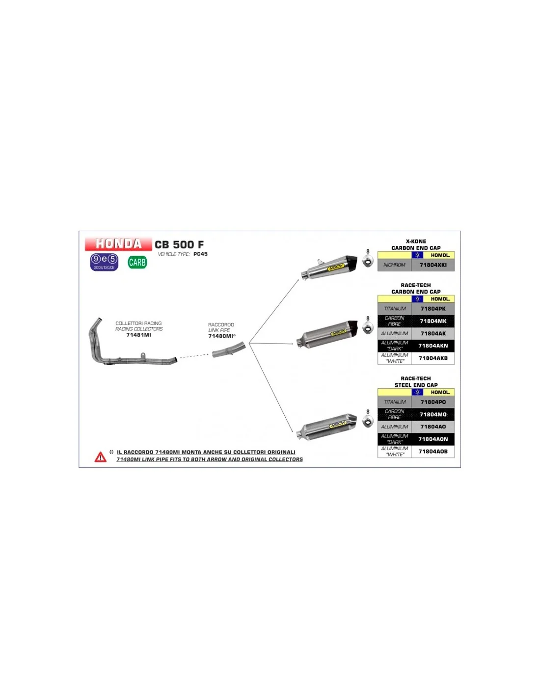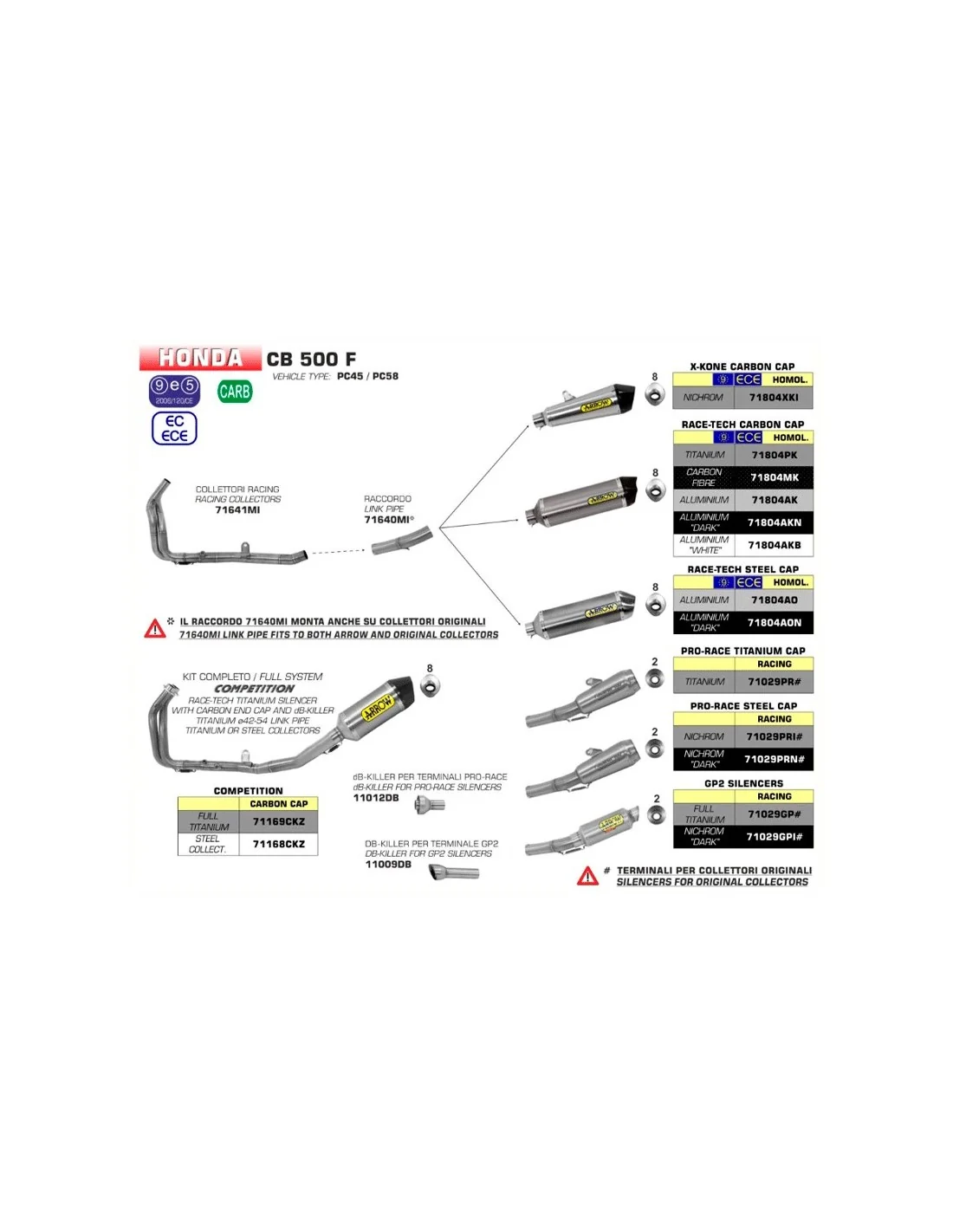 Los silenciosos de la línea Race-Tech están disponibles en la versión de homologados para Honda CB 500 X / F, y están equipados con un DB-Killer extraíble. Estos escapes se fabrican en titanio, fibra de carbono o en aluminio. Para algunas motos el silencioso de titanio también está disponible con la nueva terminación en fibra de carbono.
