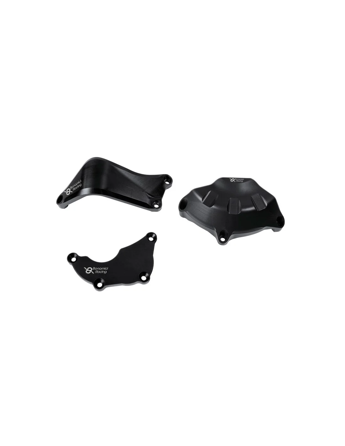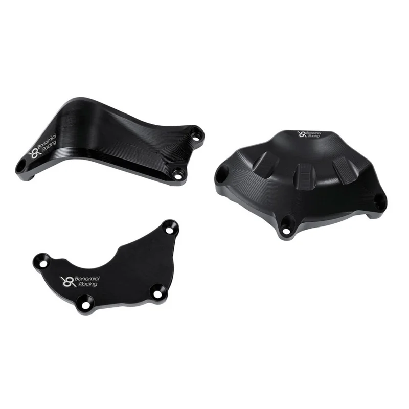De la colaboración con los equipos que compiten en el campeonato mundial de superbikes, nacen las protecciones de cárter motor Bonamici Racing. En aleación de aluminio de alta resistencia, mecanizado en macizo con tecnología CNC y acabado con anodizado negro, el kit protege perfectamente las carcasas de la moto en caso de caída.