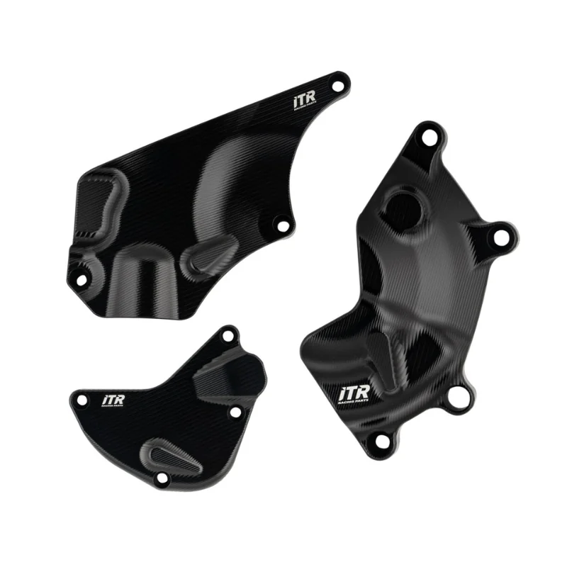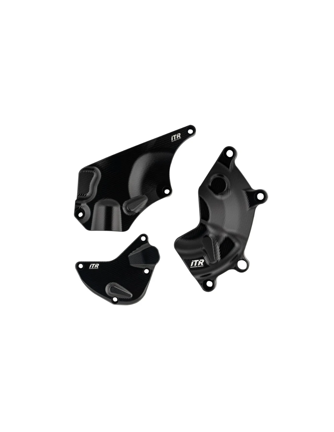 Tapas protectoras con Homologación para competir en FIM y en CEV. Juego de protectores de motor metálicos en aluminio negro, marca ITR. En color negro. Tapas de motor Yamaha R1 desde 2015 al 2025.