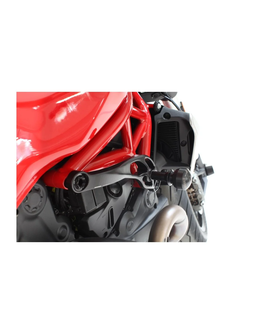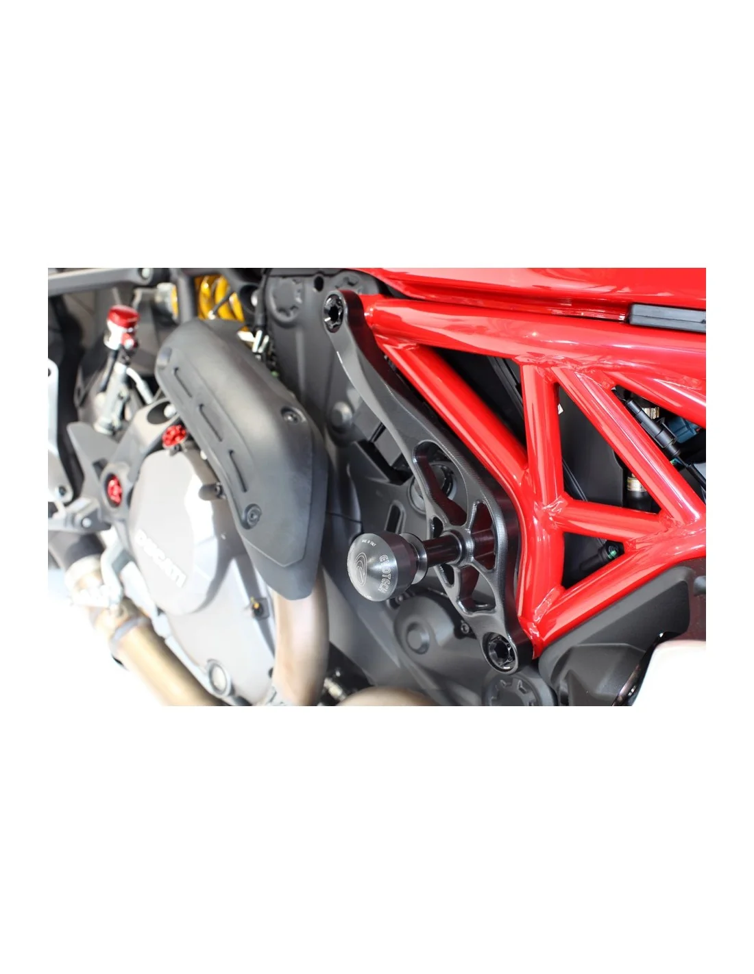 En el extremo del protector va alojada una pieza especial realizada en Delrin, un material plástico auto lubricado muy técnico con un coeficiente de rozamiento mínimo, que evita paradas súbitas de la moto contra el asfalto que podrían causar mayores daños. Entre la pieza de Delrin y el taco se aloja un anillo plástico anti vibraciones que evita la pérdida del extremo.